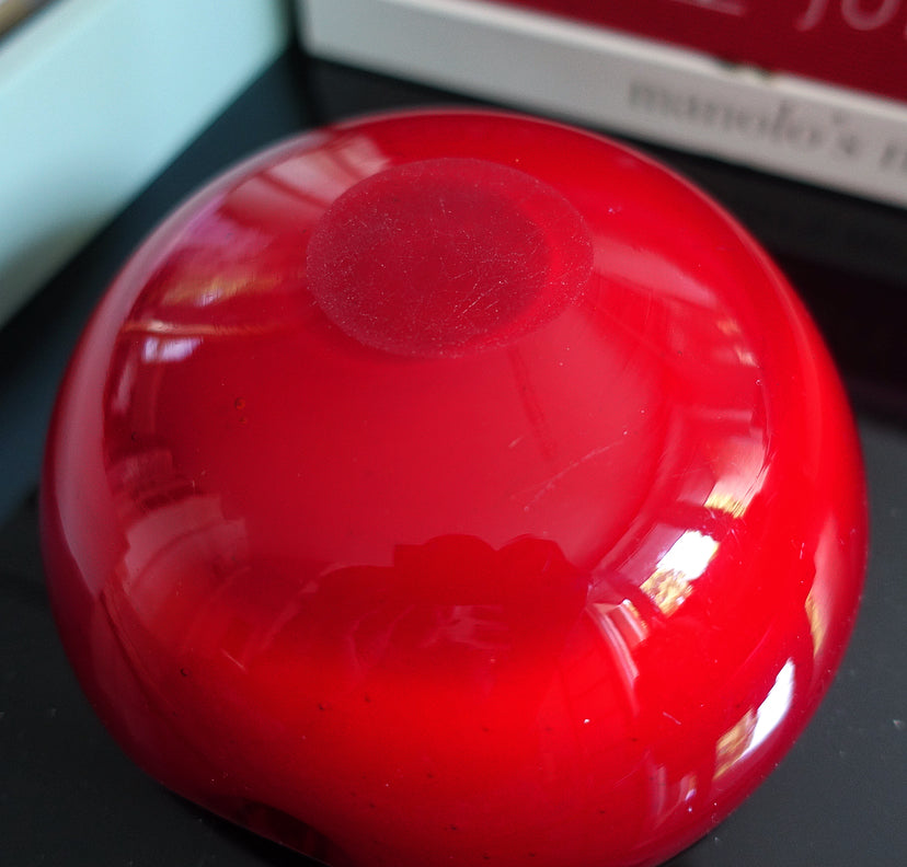 Made with twisted coloured ribbon canes, copper aventurine, white zanfirico filigree with silver and gold leaf inclusions, cased in red glass