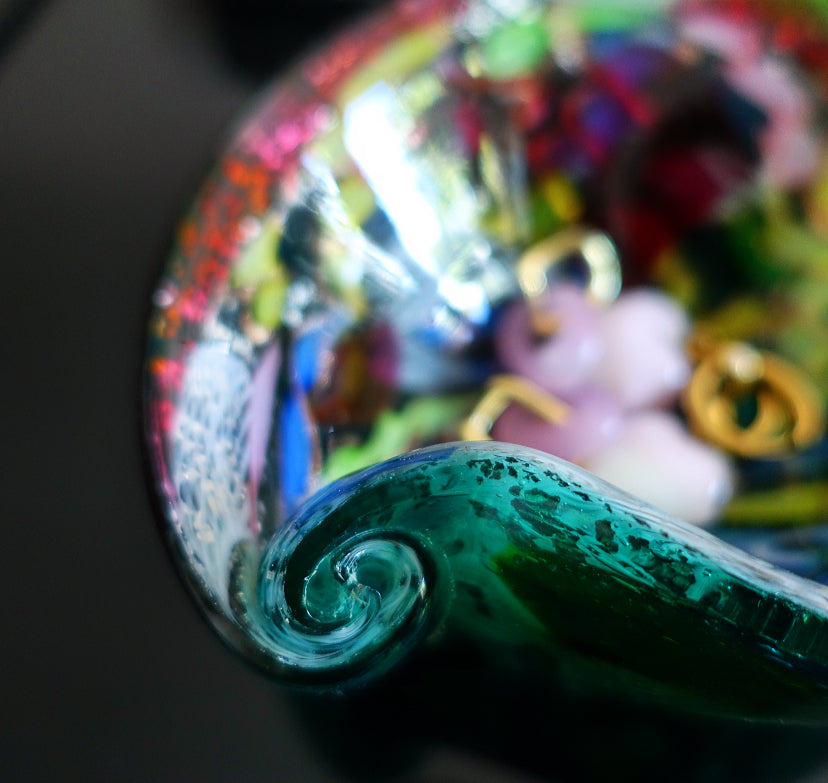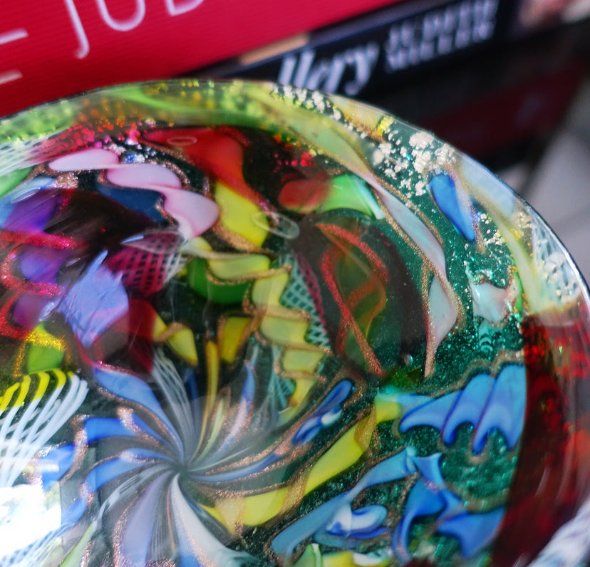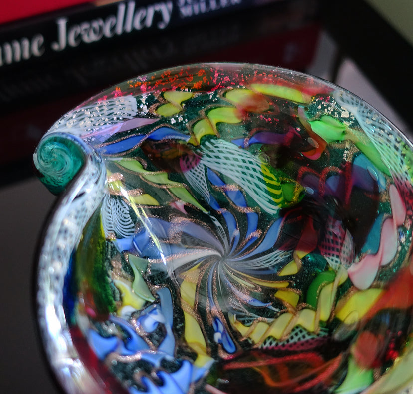 Made with coloured ribbon canes, white zanfirico filigree, Copper aventurine with silver leaf inclusions, cased in green glass with scrolled detailing