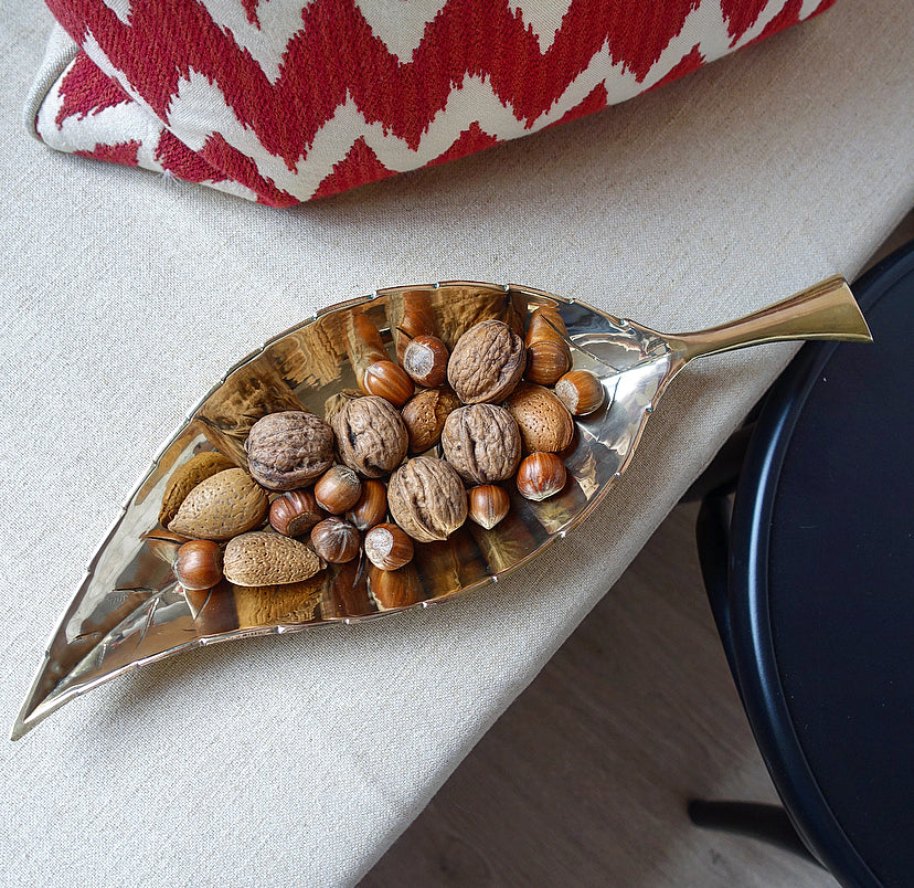 Large elegant Hollywood Regency brass leaf dish, c.1980s. Perfect for nibbles or simply to display on a coffee table, bar trolley or bedside table.
