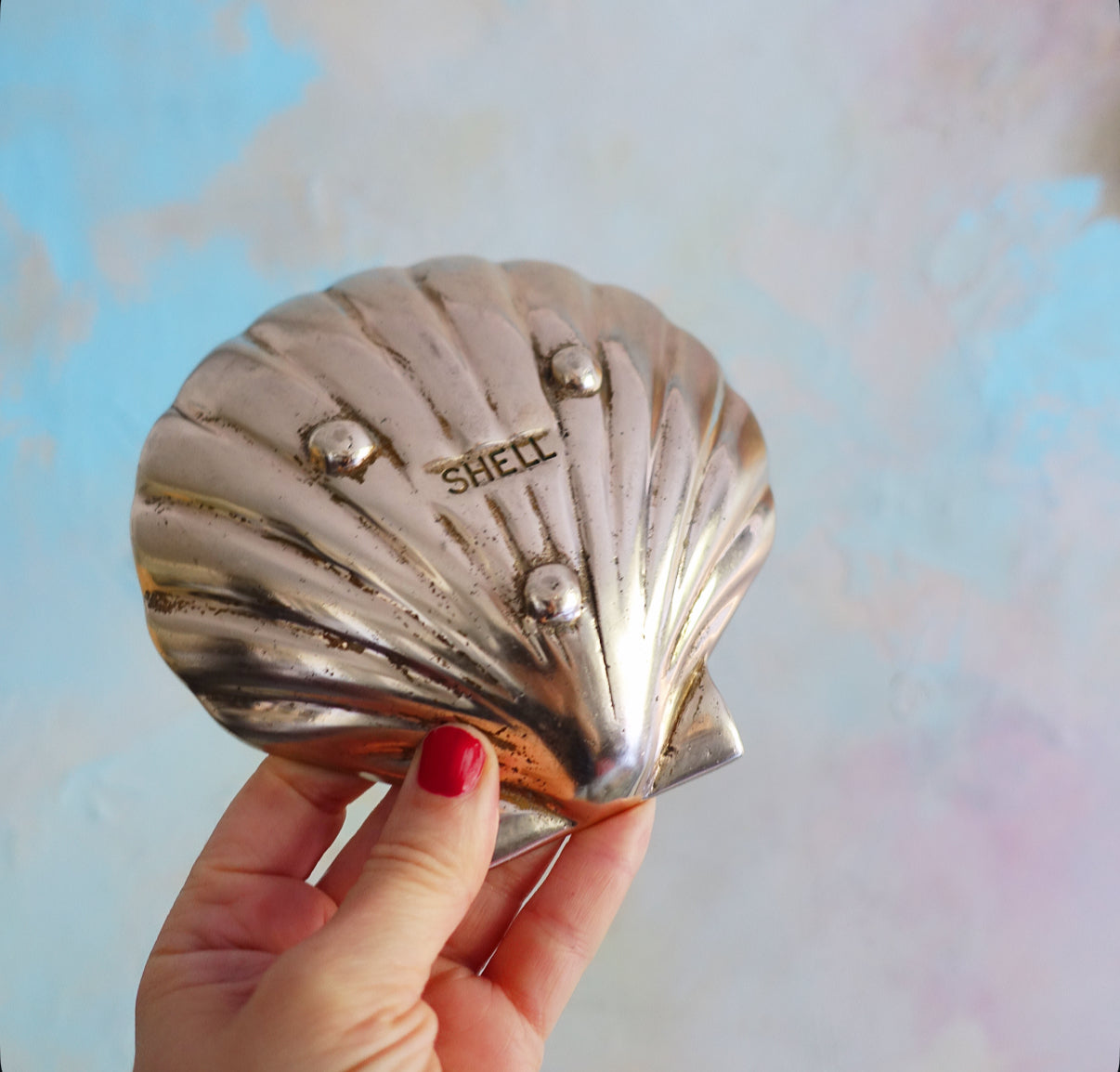 Vintage brass ‘Shell motor oil’ memorabilia scallop shell ashtray/ trinket dish, c.1960s