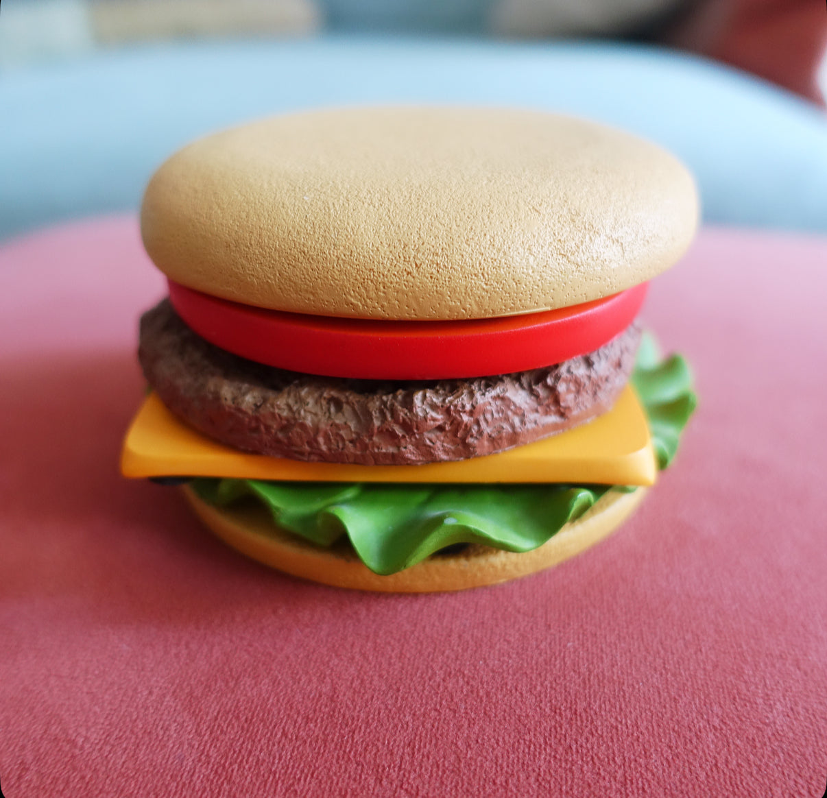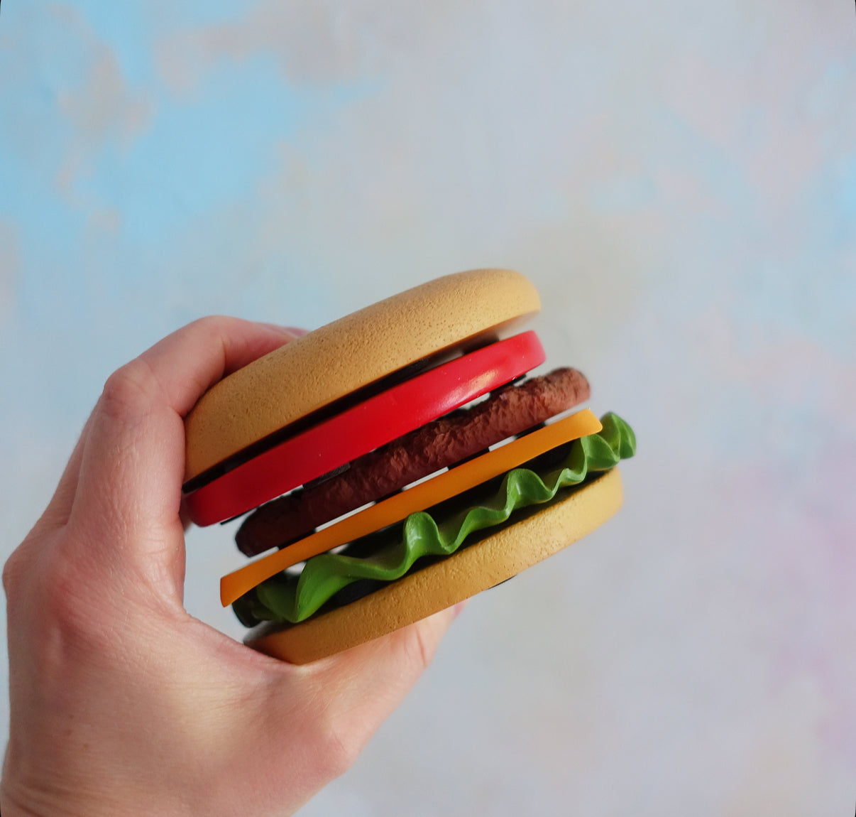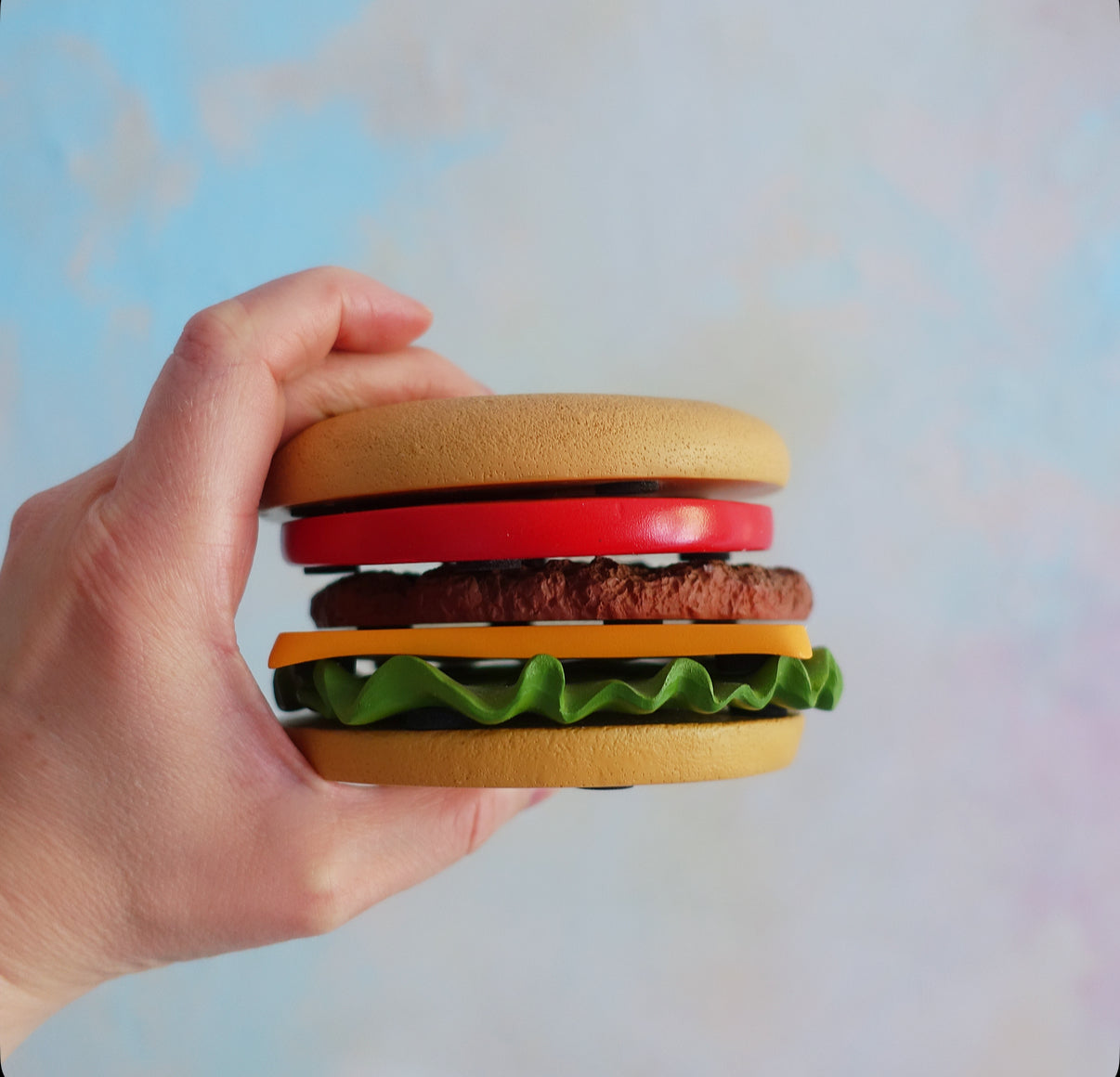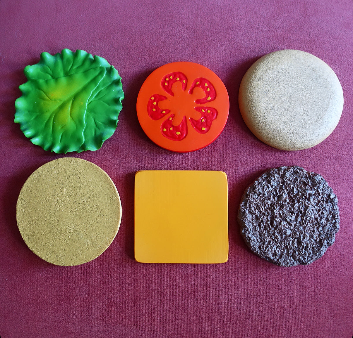 Six coasters in the form of a burger bun top, tomato, cheese, lettuce, beef patty and burger bun base