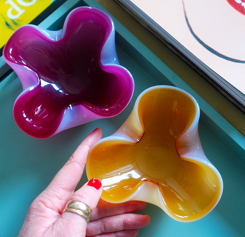 Sweet little Mid-Century Murano glass butterscotch Murano glass trinket dish with opaque glass underside, c.1960s