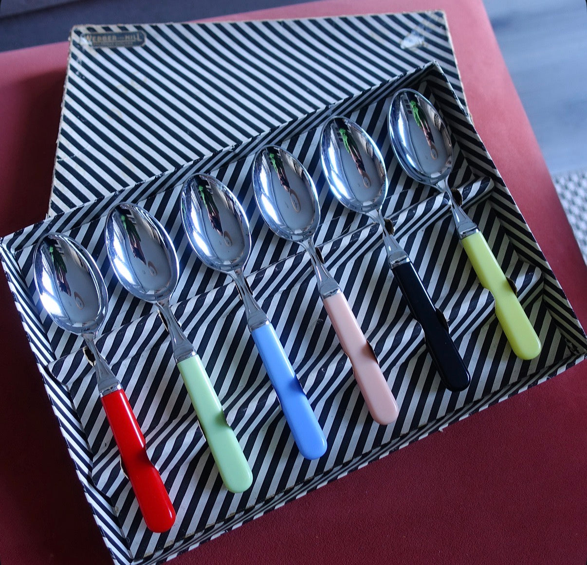 Set of six Mid-Century Sheffield chrome plated and coloured Bakelite handled dessert spoons in original box, c.1960s