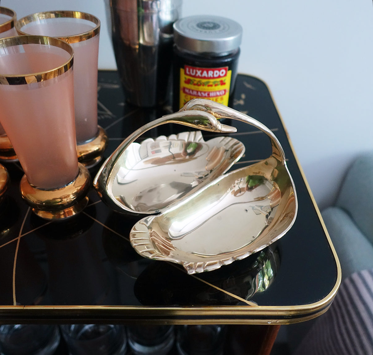 Pretty vintage Hollywood Regency double brass swan trinket dish, c.1970s/80s