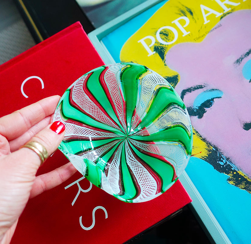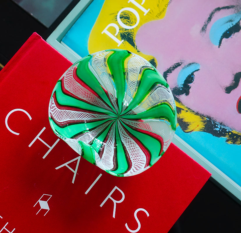 Made with twisted green ribbon canes and white Zanfirico filigree with characteristic rough pontil to the base