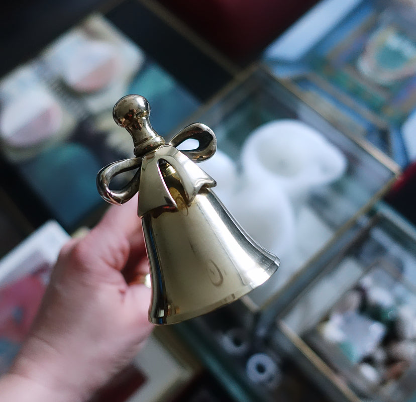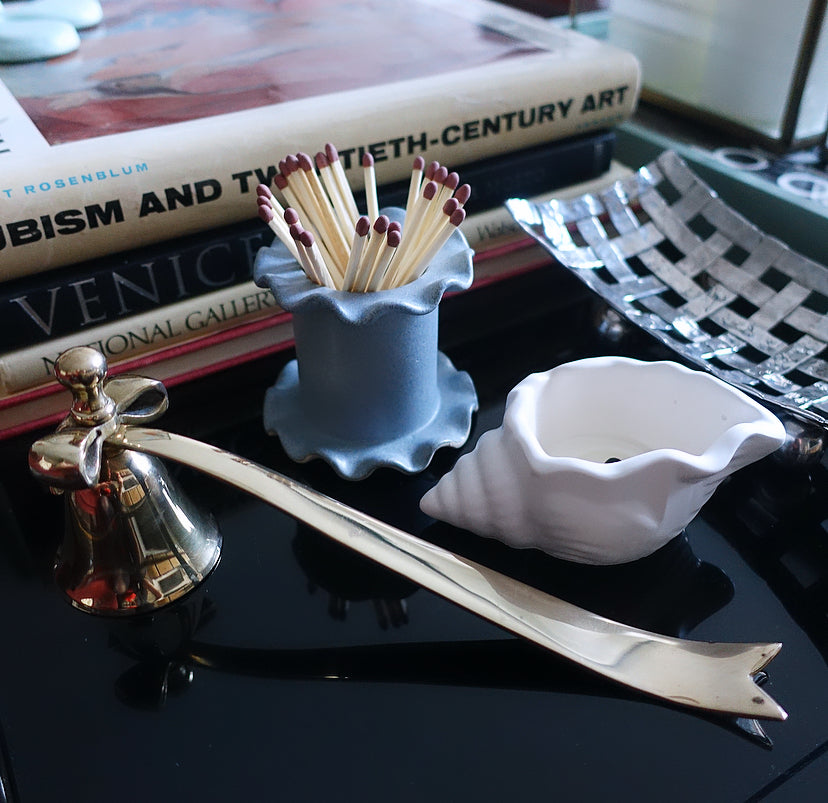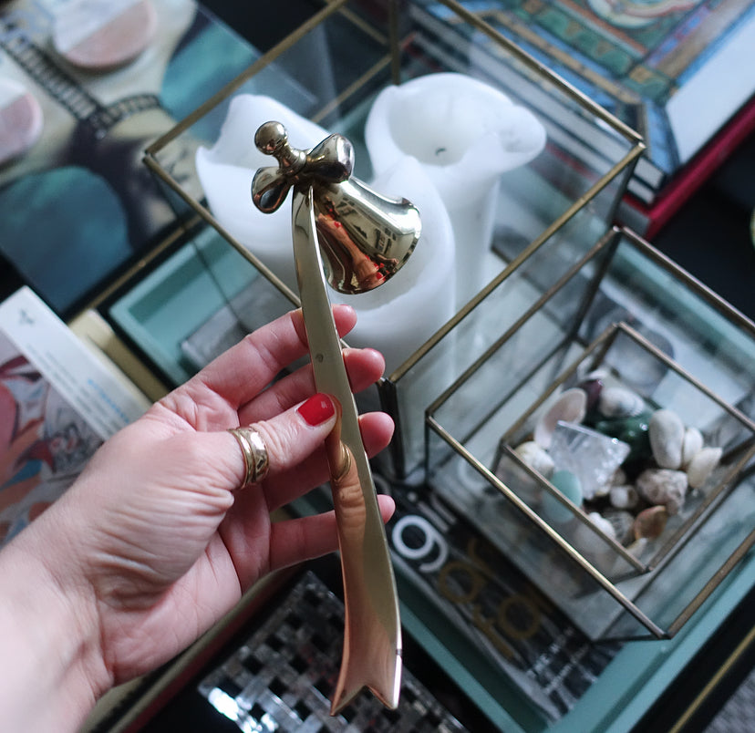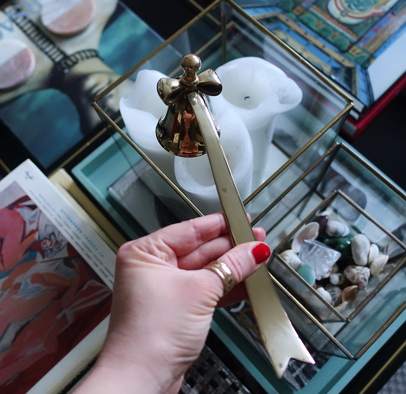The prettiest candle snuffer IMO - Gorgeous brass Hollywood Regency bow candle snuffer with ribbon handle, c.1980s.