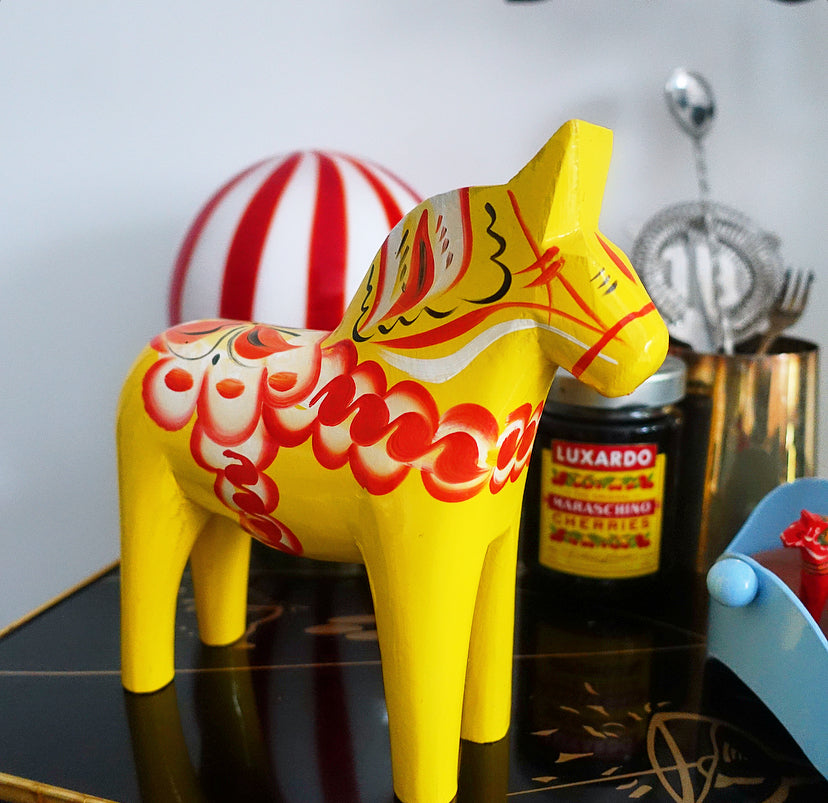 Vintage wooden Swedish folk art hand painted yellow Dala horse by Nils Olsson, c.1980s