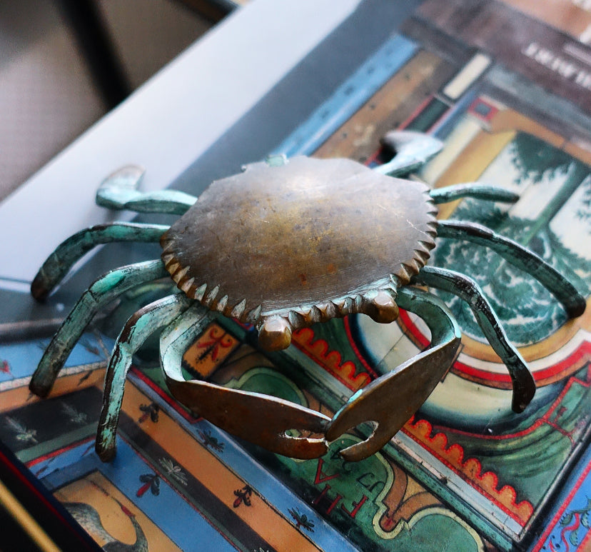 Lovely decorative piece with hinged lid, painted green wash on brass to create an aged effect