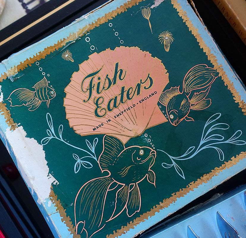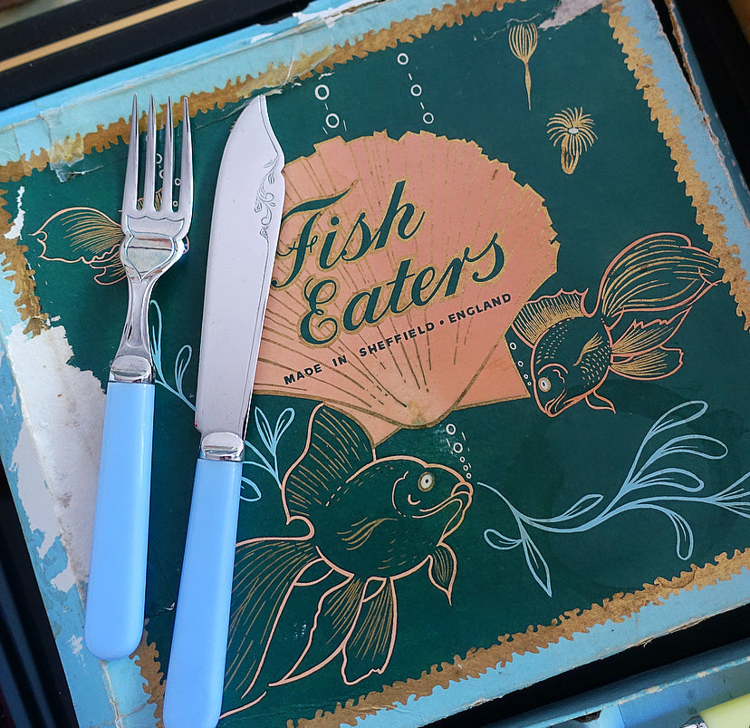 Super fun 12 piece Mid-Century Sheffield stainless steel & rainbow Bakelite handled fish cutlery set, c.1950s