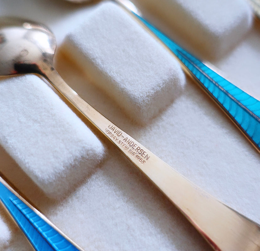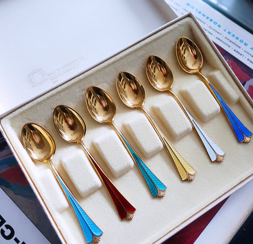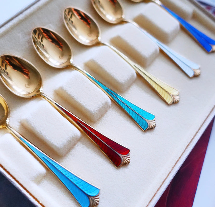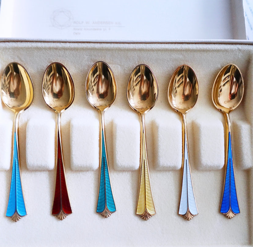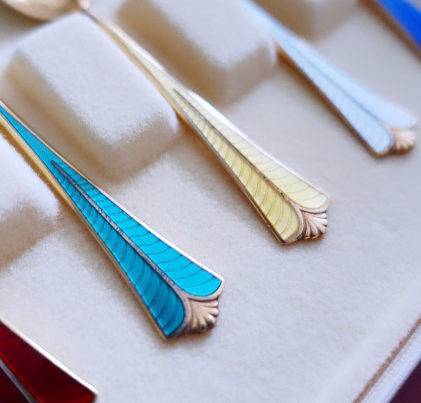 Superb set of six Mid-Century Norwegian Sterling silver gilt spoons with rainbow Guilloché enamel handles & scallop shell detailing by David Andersen, retailed by Rolf Andersen, c.1960s