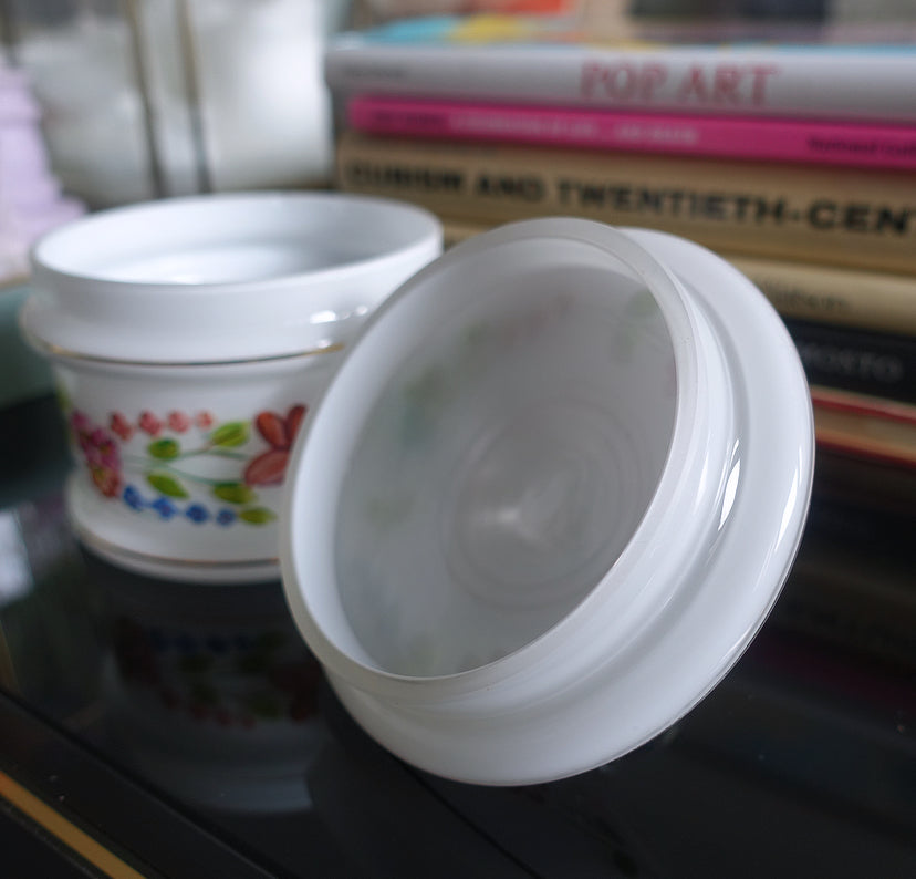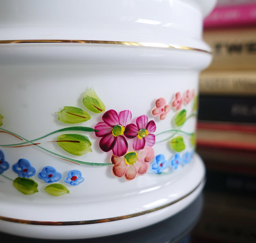 Pretty Mid-Century white opaline glass vanity jar with hand painted enamel floral detailing and controlled bubble glass finial, c.1960s