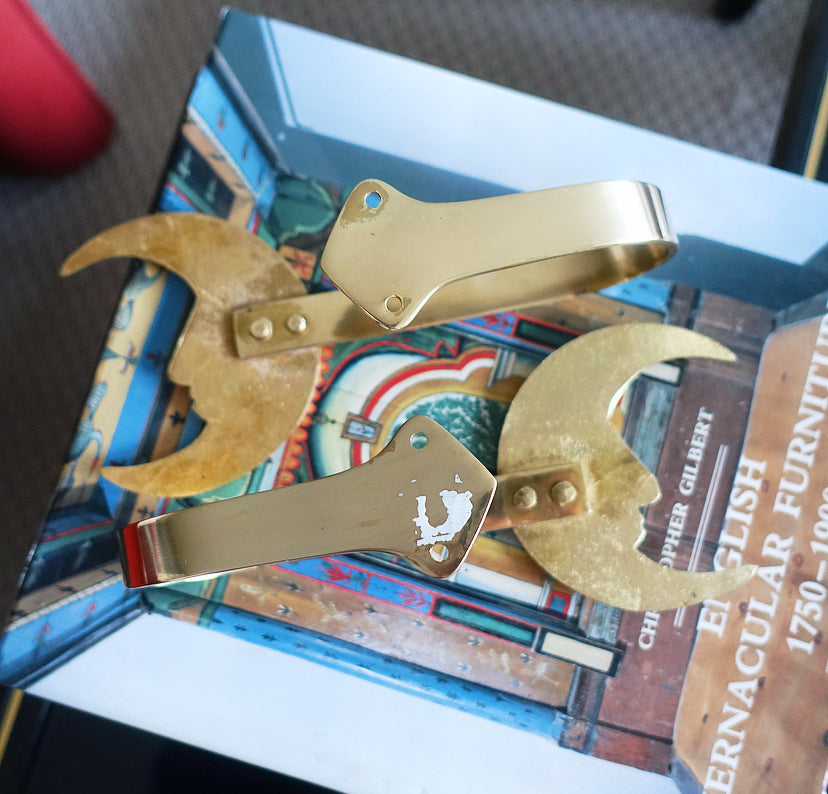 Fun pair of vintage brass man in the moon curtain tie-backs, c.1980s