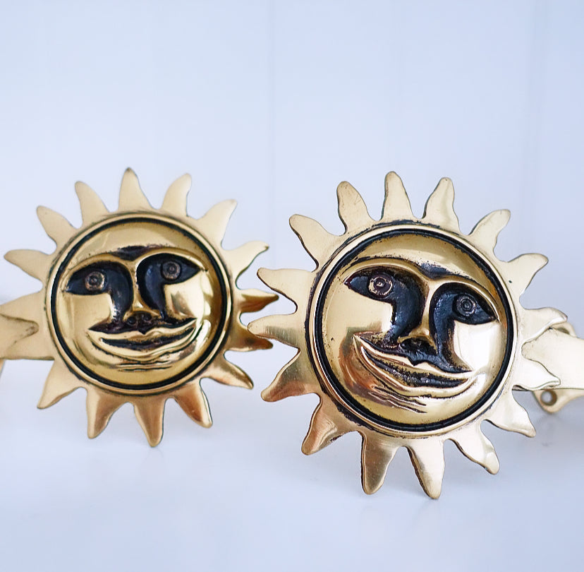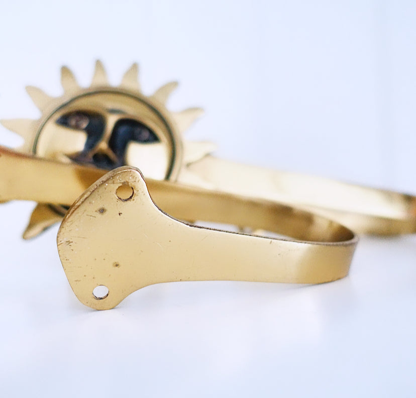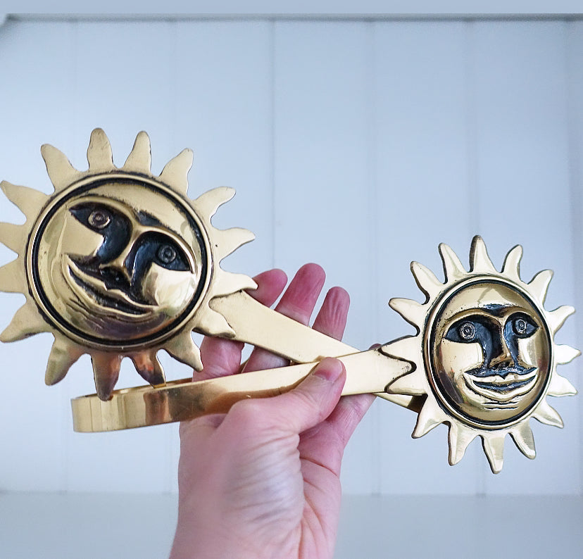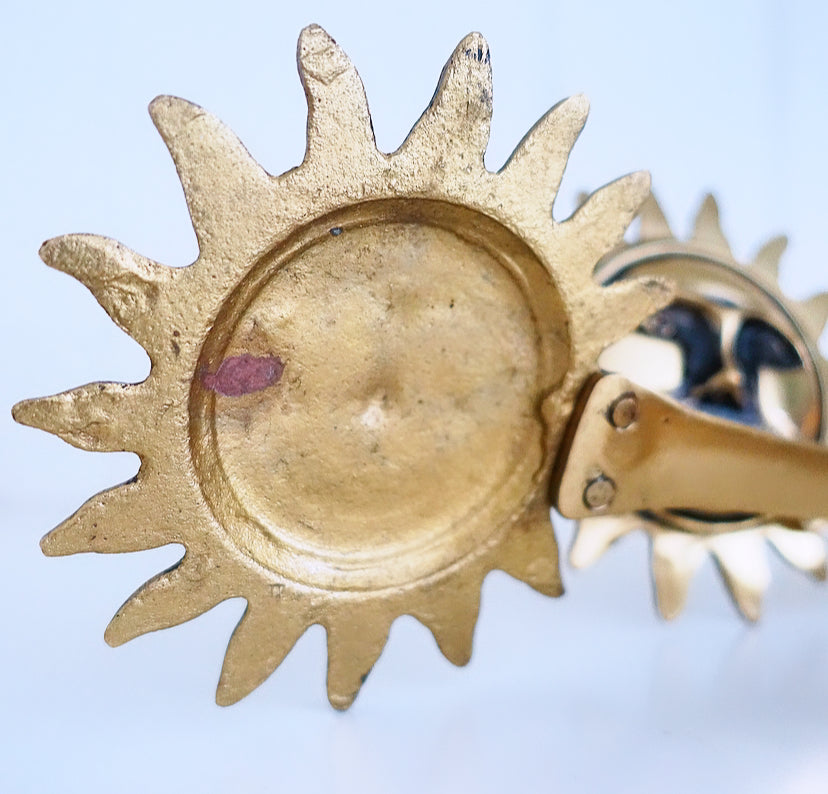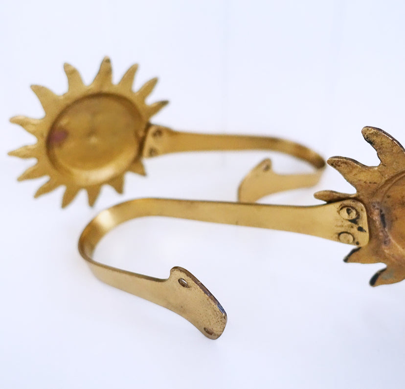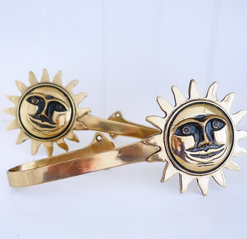Pair of fun lacquered brass sun curtain tie-backs, c.1980s.