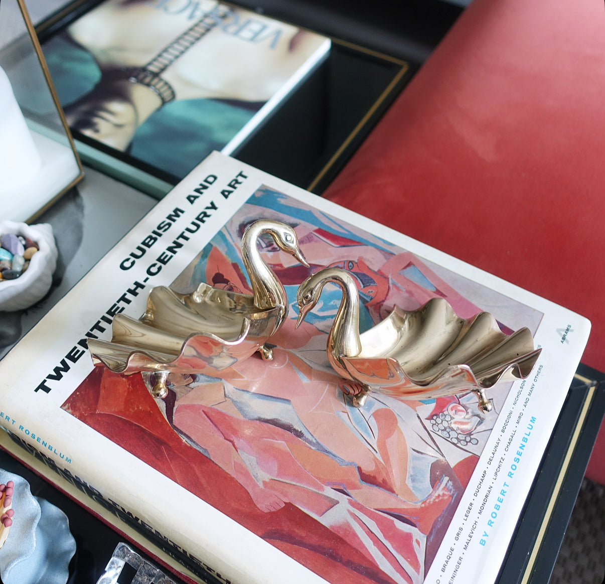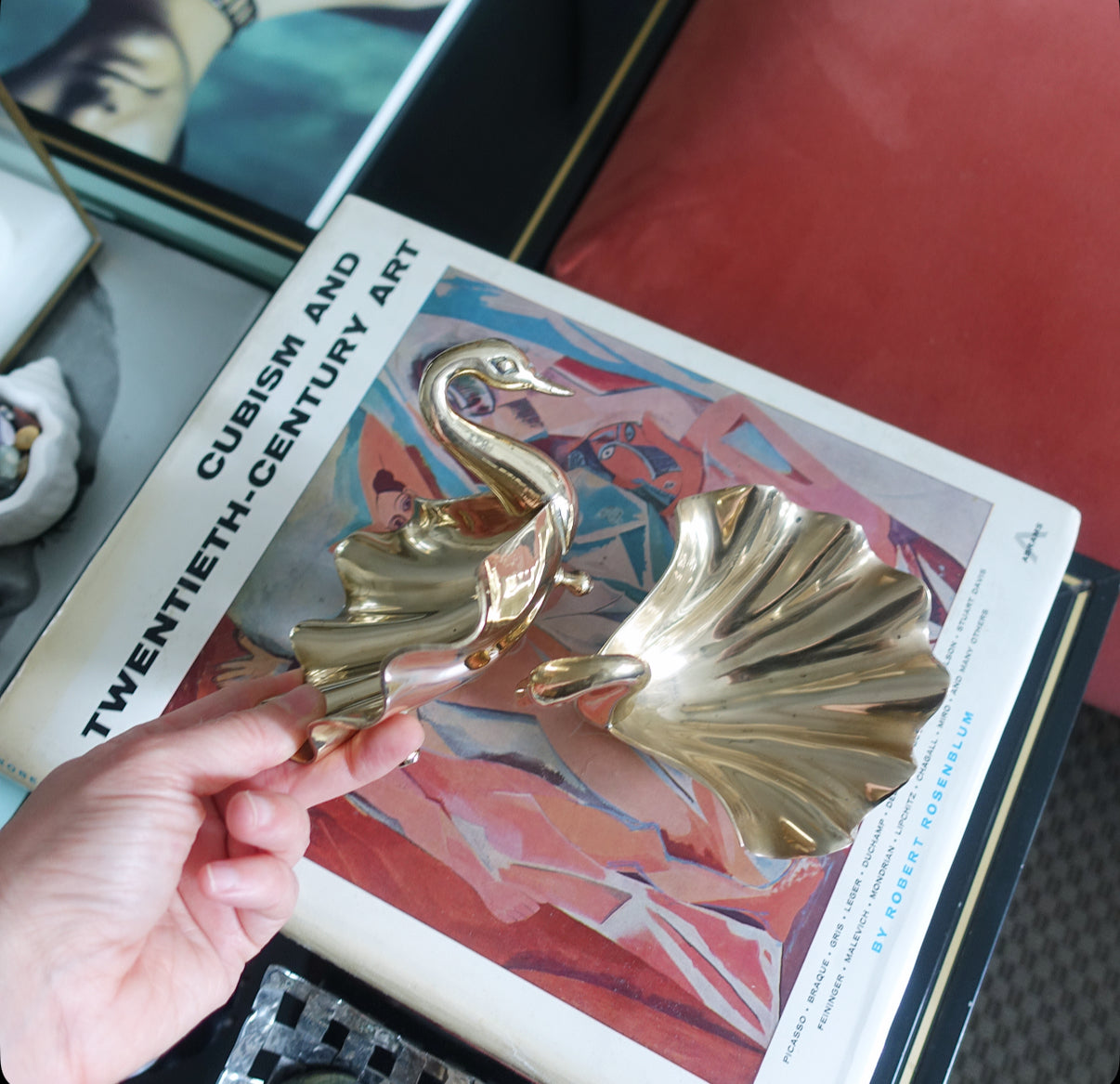 Delightful pair of vintage Hollywood Regency brass swan trinket dishes, c.1970s/80s