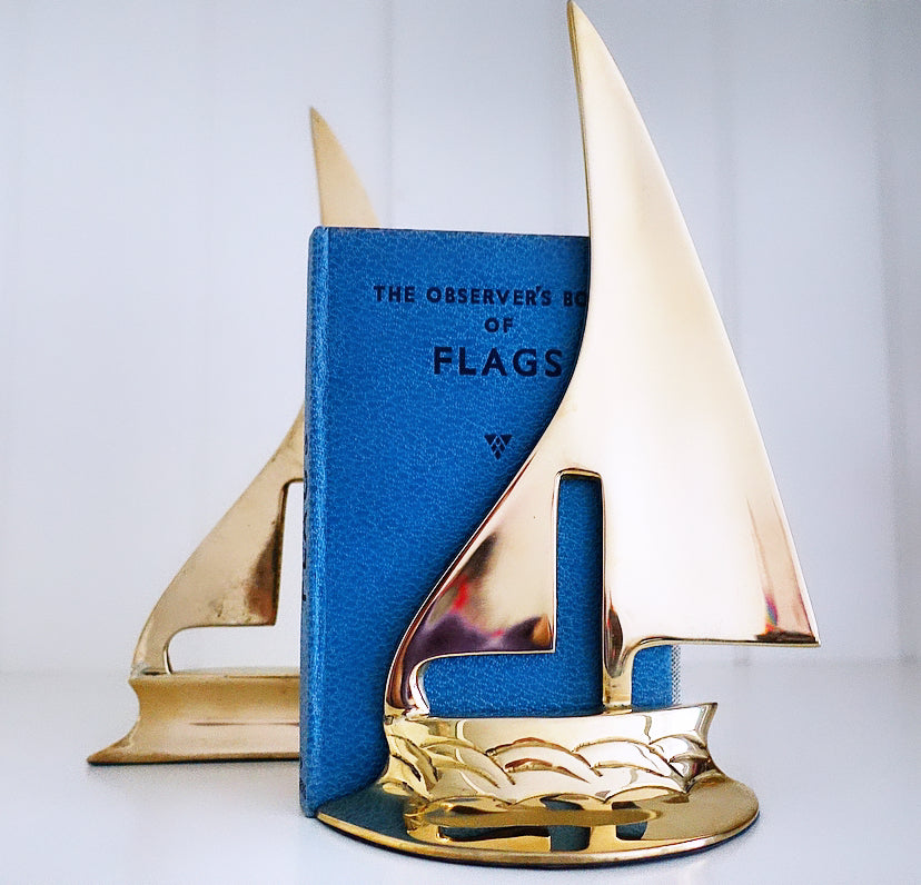 Charming pair of stylised vintage brass yacht bookends, c.1980s. I just love the little wave detailing!