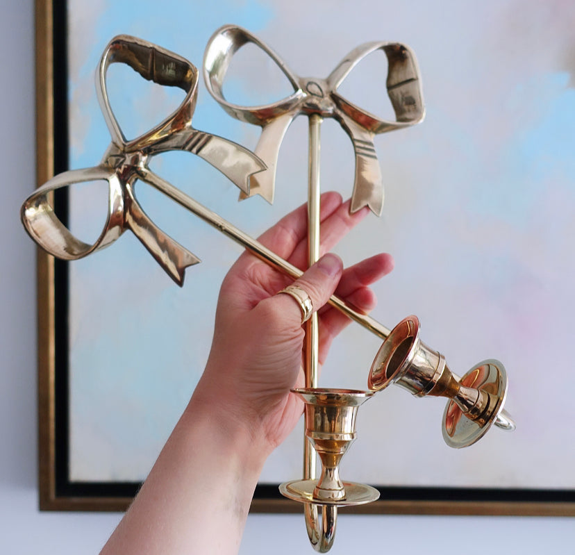 Pretty pair of Hollywood Regency brass bow candle wall sconces c.1980s. Simple & elegant design with hooks on the back, perfect for either side of a fireplace or mirror.