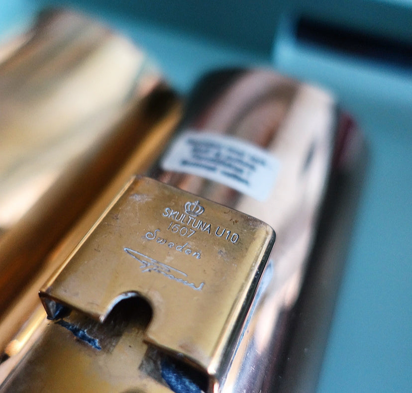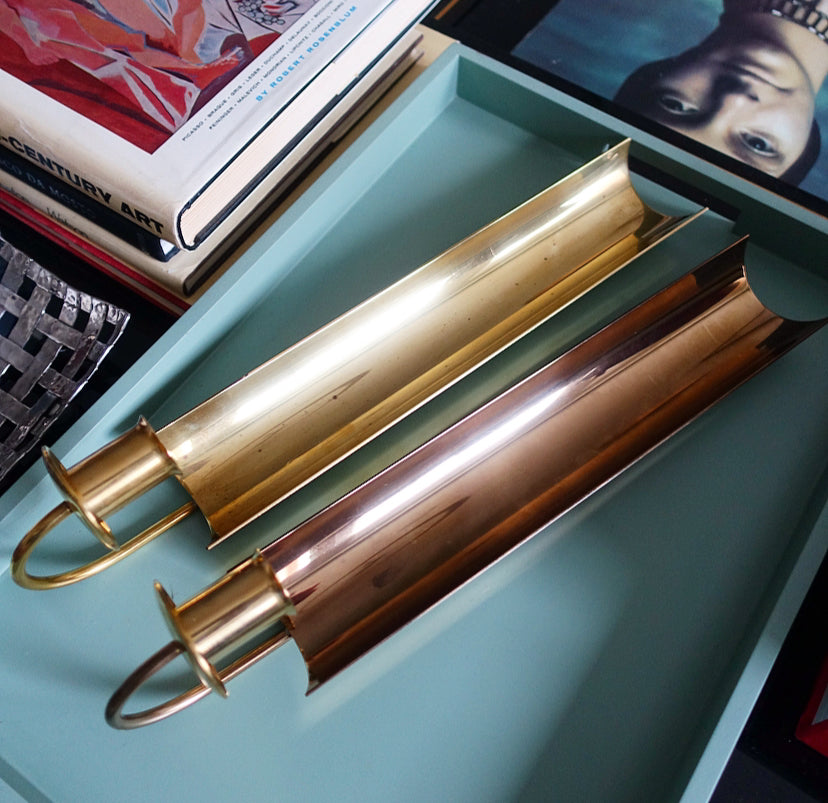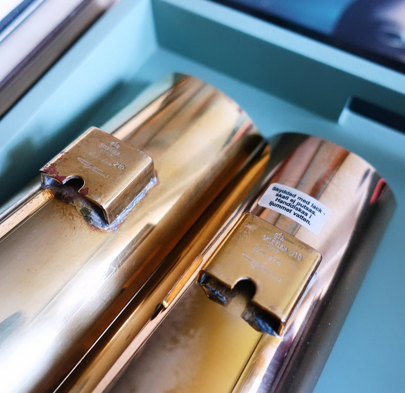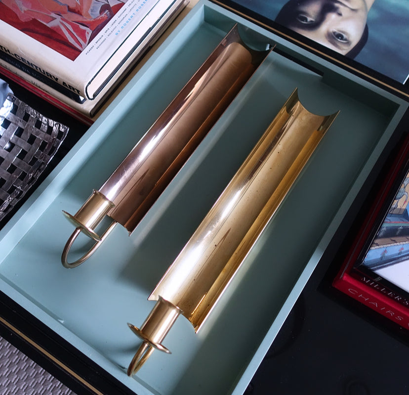 Please note these are not an exact pair as they were produced in different years - one in 1994, the other in 1999 so they have different serial numbers on the back and one is lacquered brass so is darker in colour and cannot be polished.