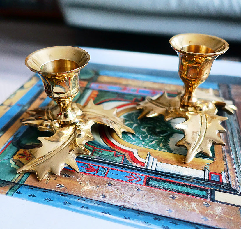 Sweet pair of small vintage brass holly leaf candle holders, c.1980s