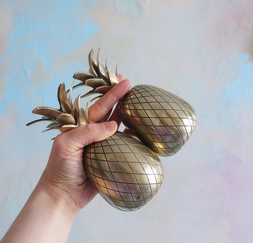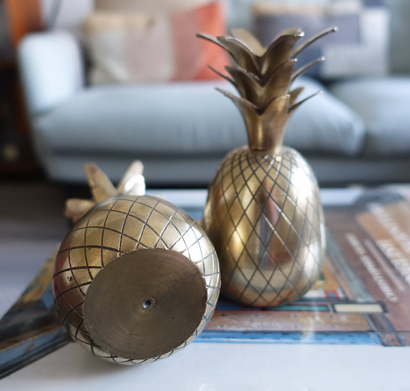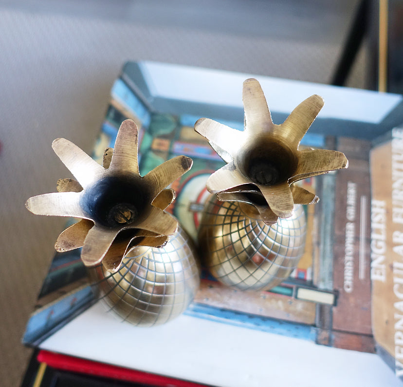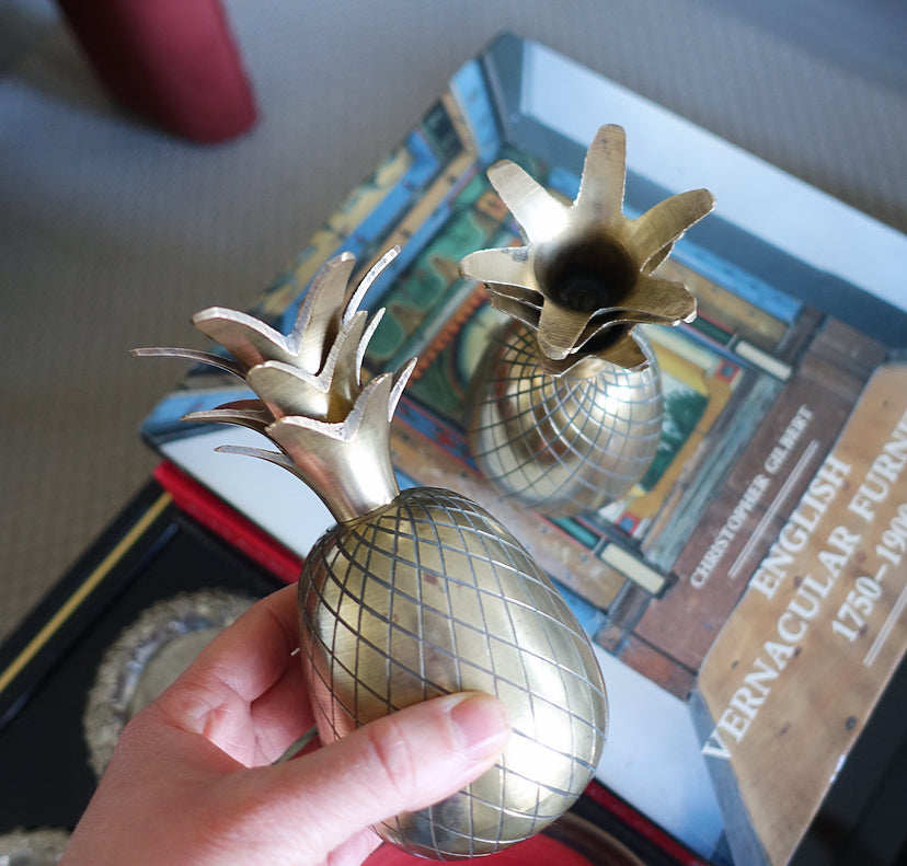 Cute pair of vintage Hollywood Regency decorative brass pineapples, c.1980s