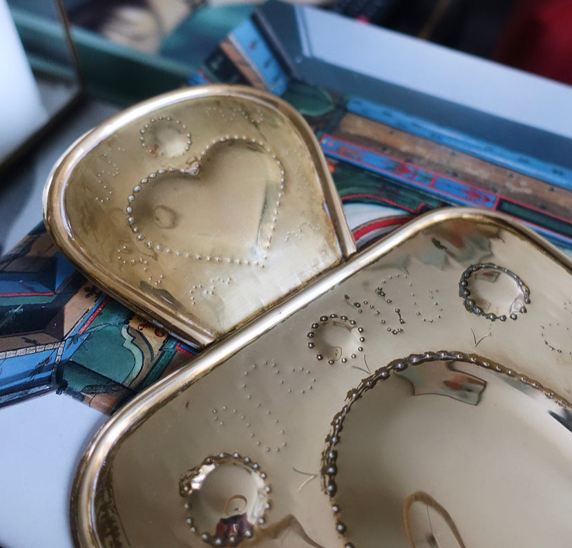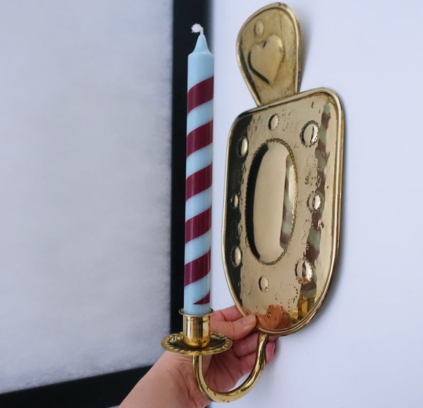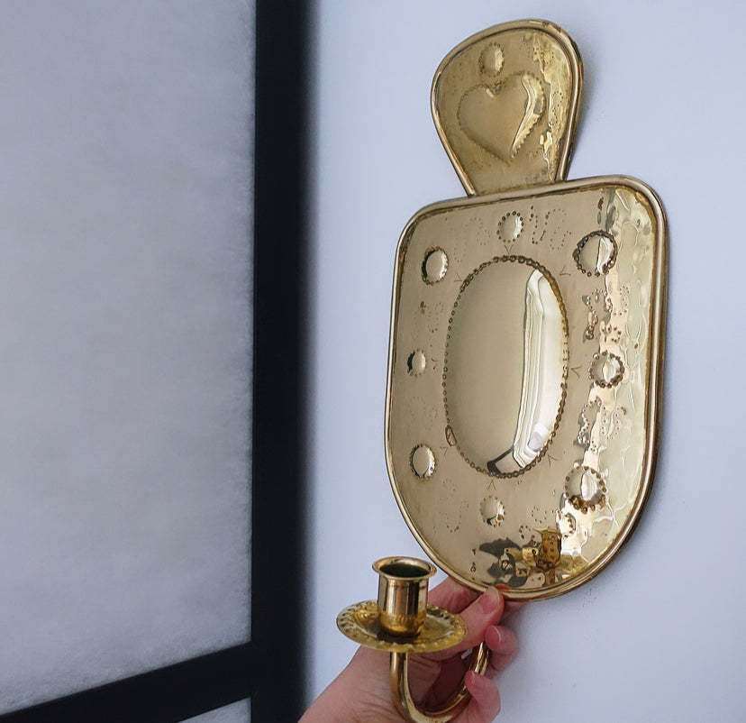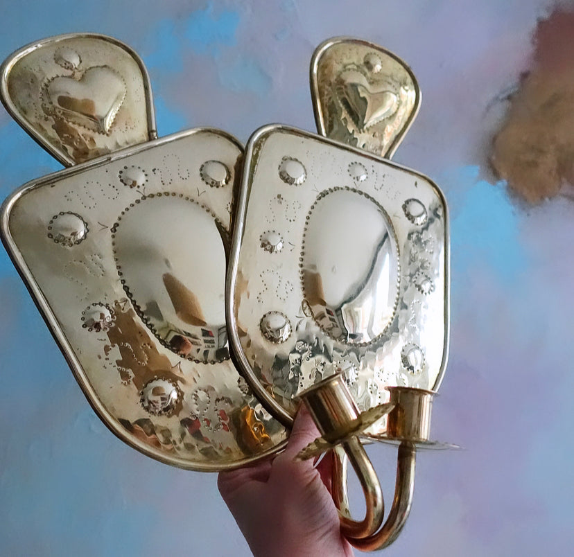 Stunning pair of Mid-Century Swedish folk revival brass wall candle sconces with embossed heart detailing, holds regular dinner candles, beautiful design.