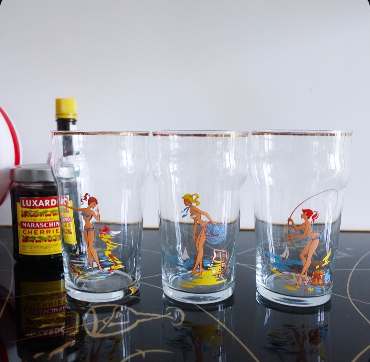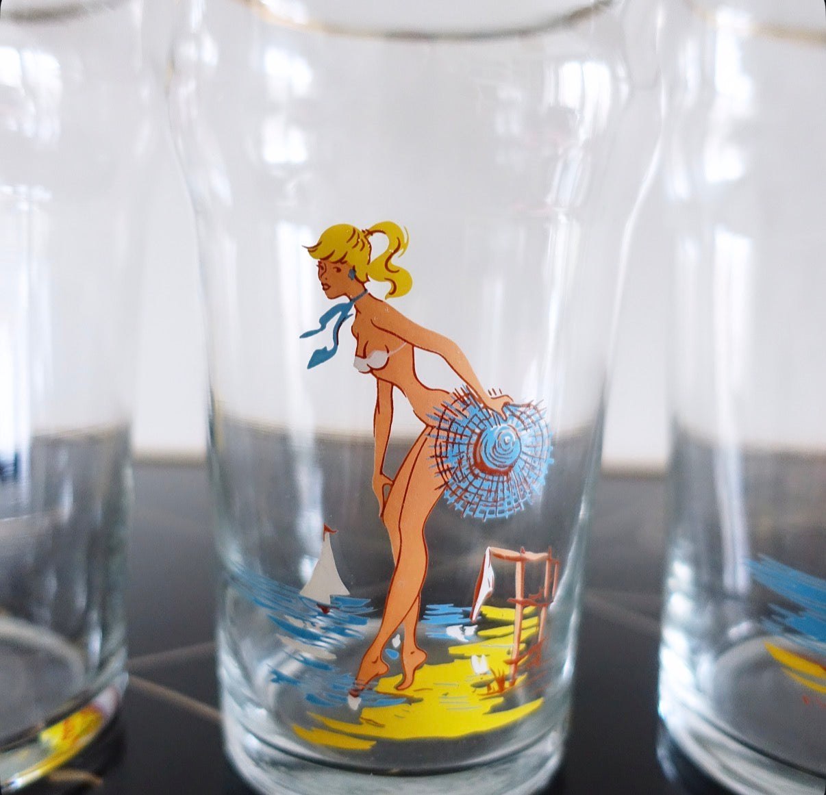 Set of three cheeky vintage pin-up girl glasses, c.1960s