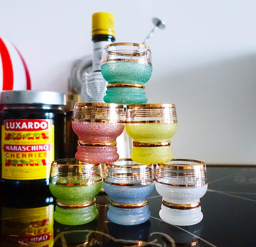Set of six small Mid-Century rainbow sugar frosted shot glasses with gilt detailing, c.1950s/60s