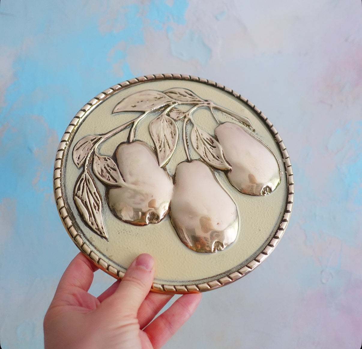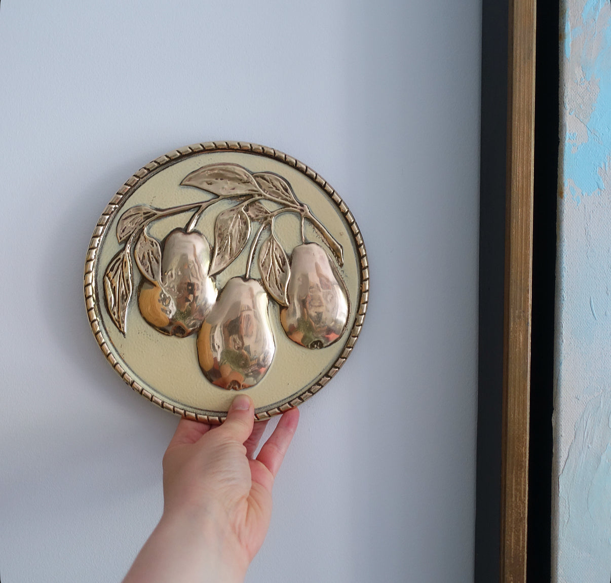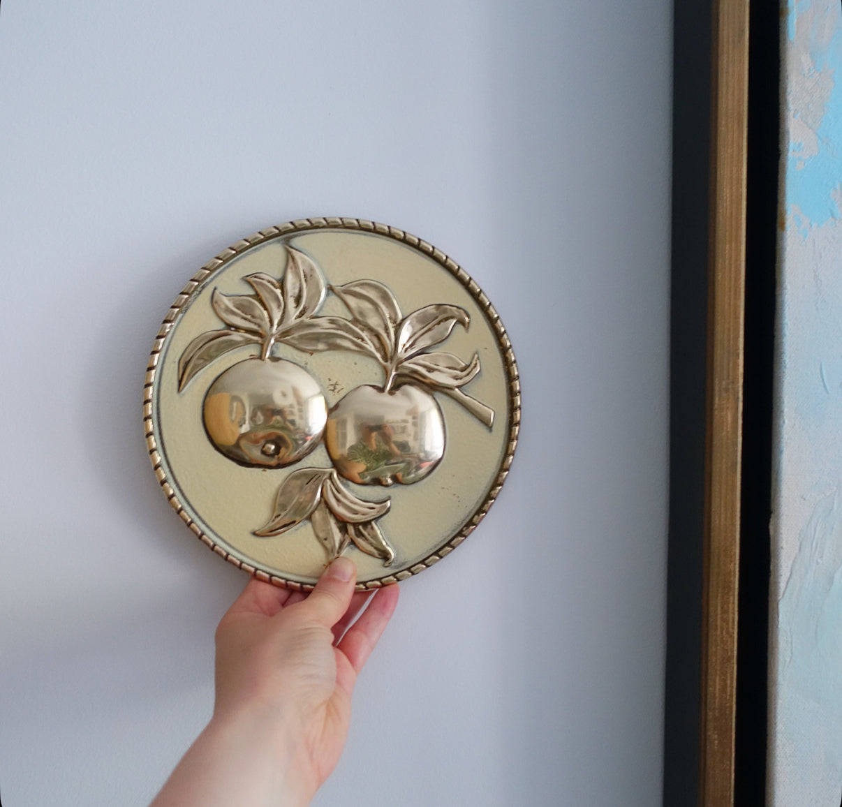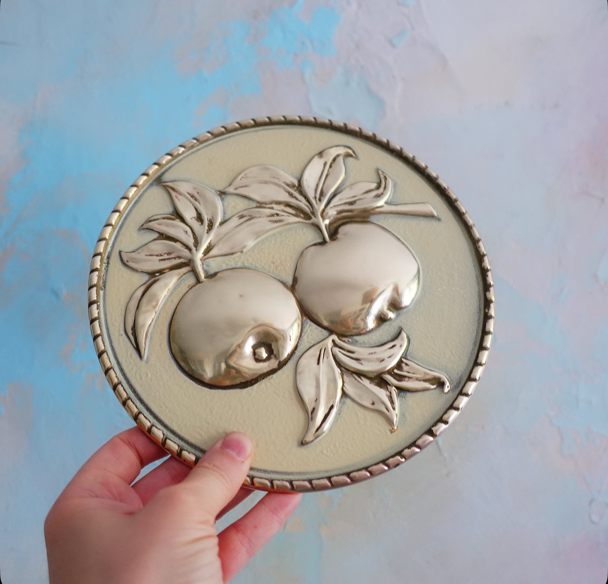 Set of four Mid-Century embossed brass fruit wall plaques by Elpec England, c.1960s