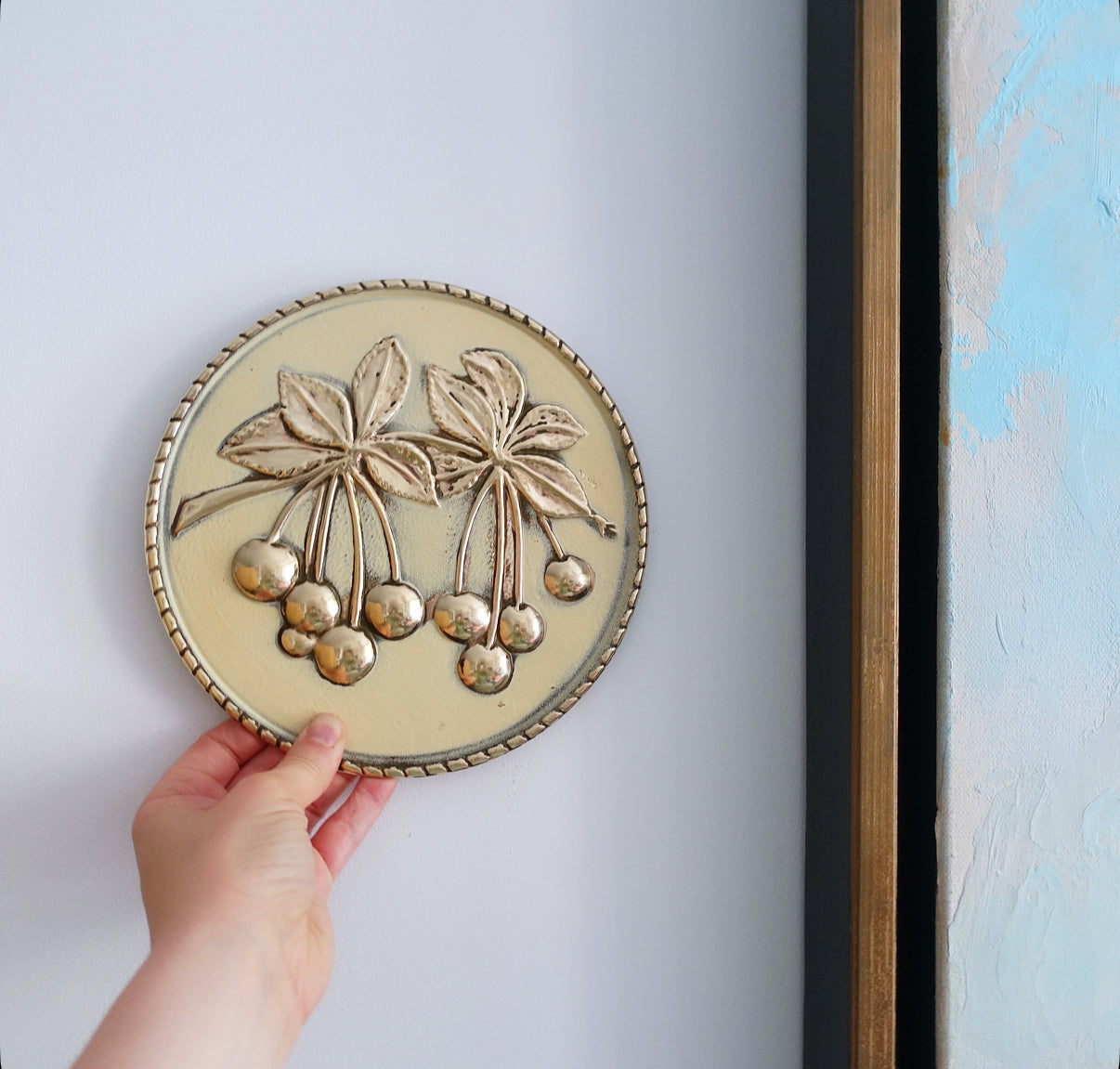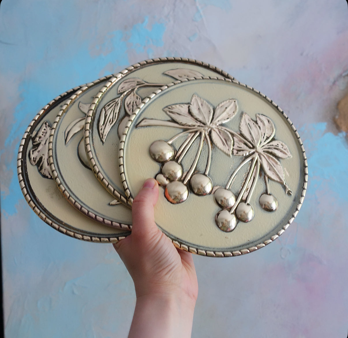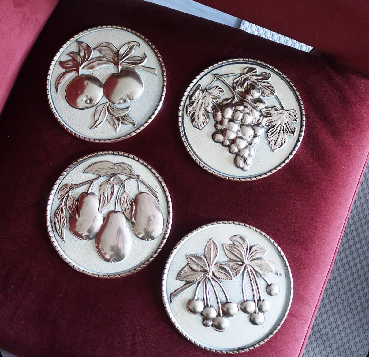 Set of four brass fruit wall plaques