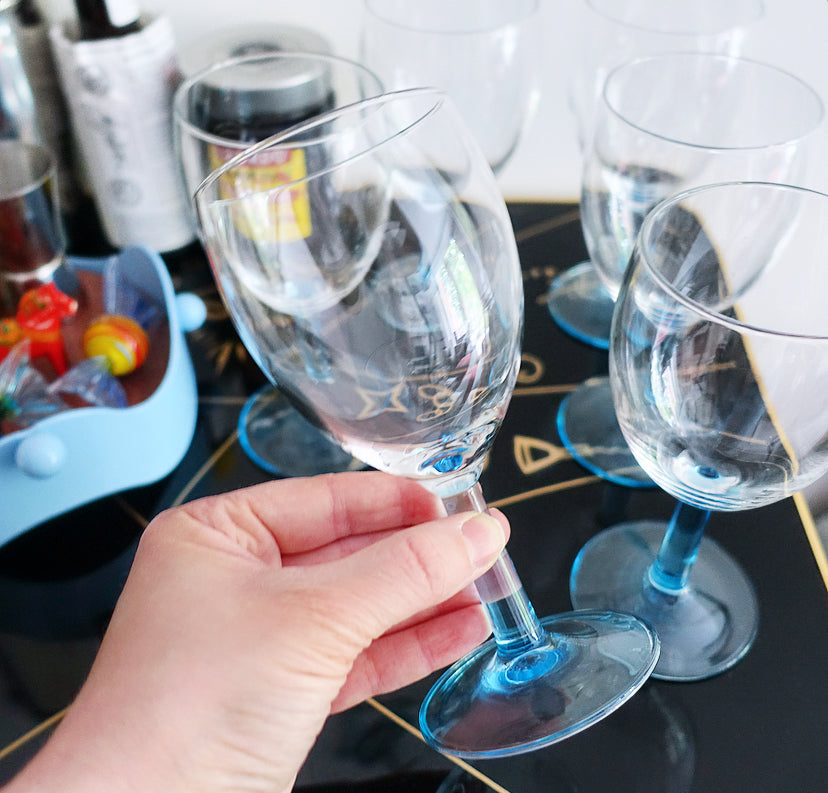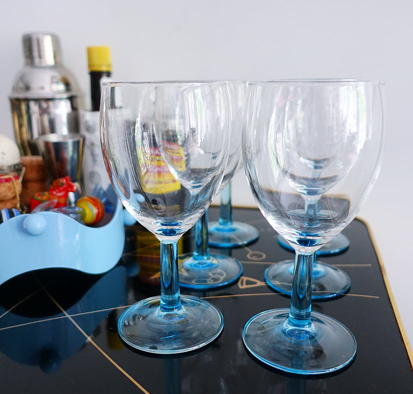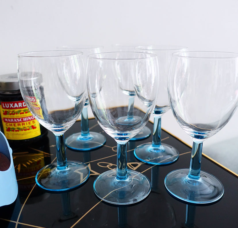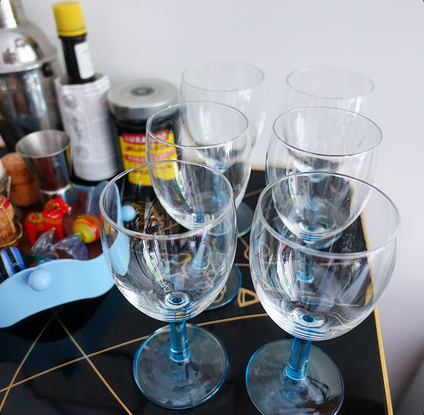 Set of six blue stem wine glasses