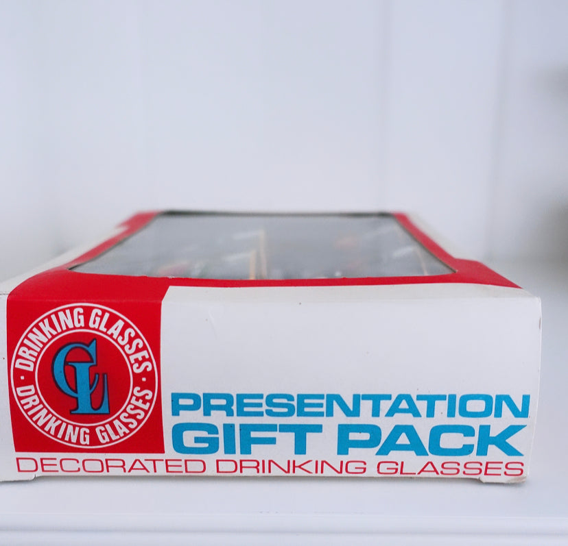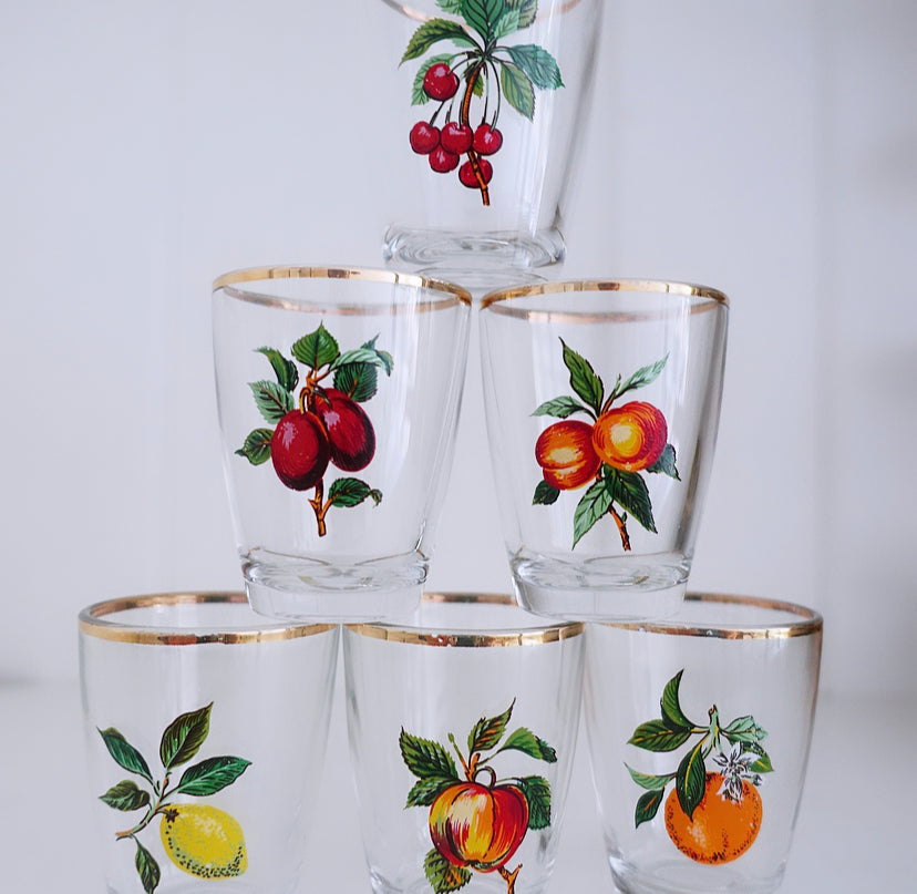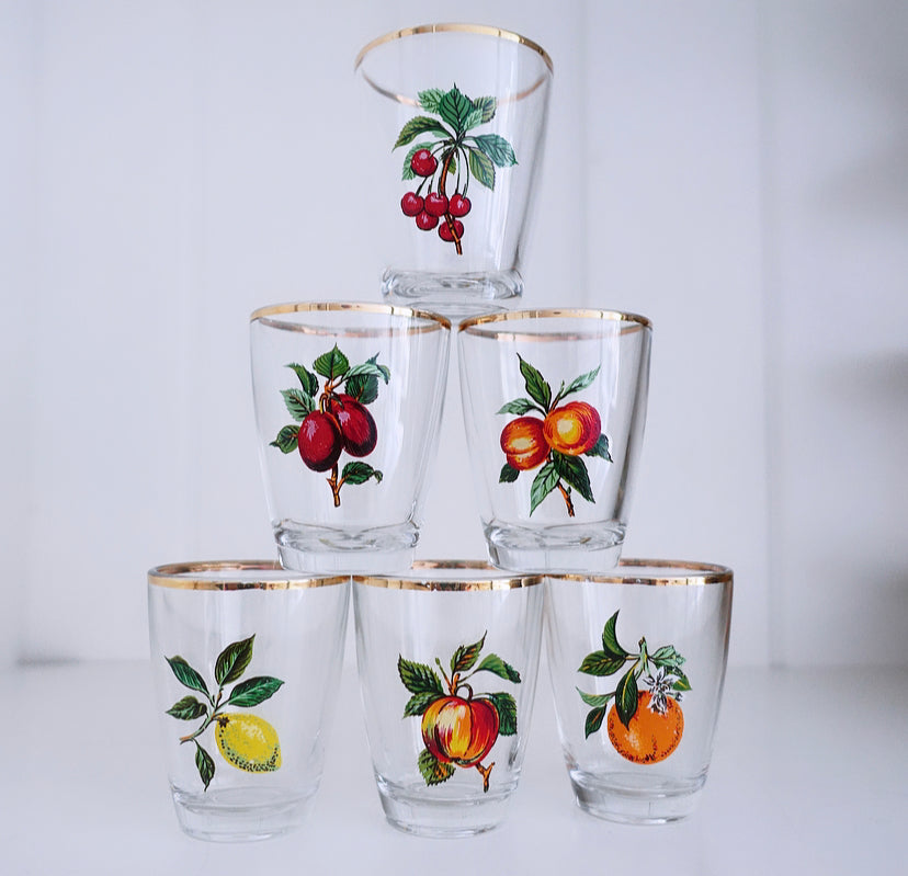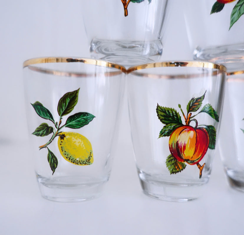 Set of six retro fruit motif shot glasses with gilt rims, c.1970s, in original box.