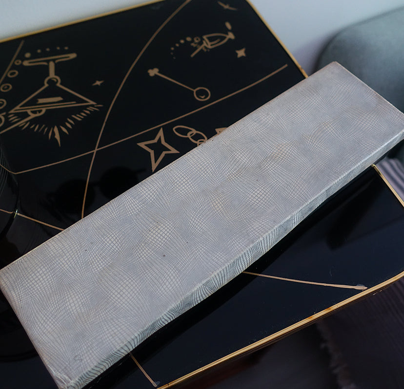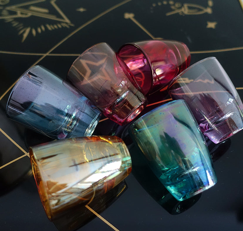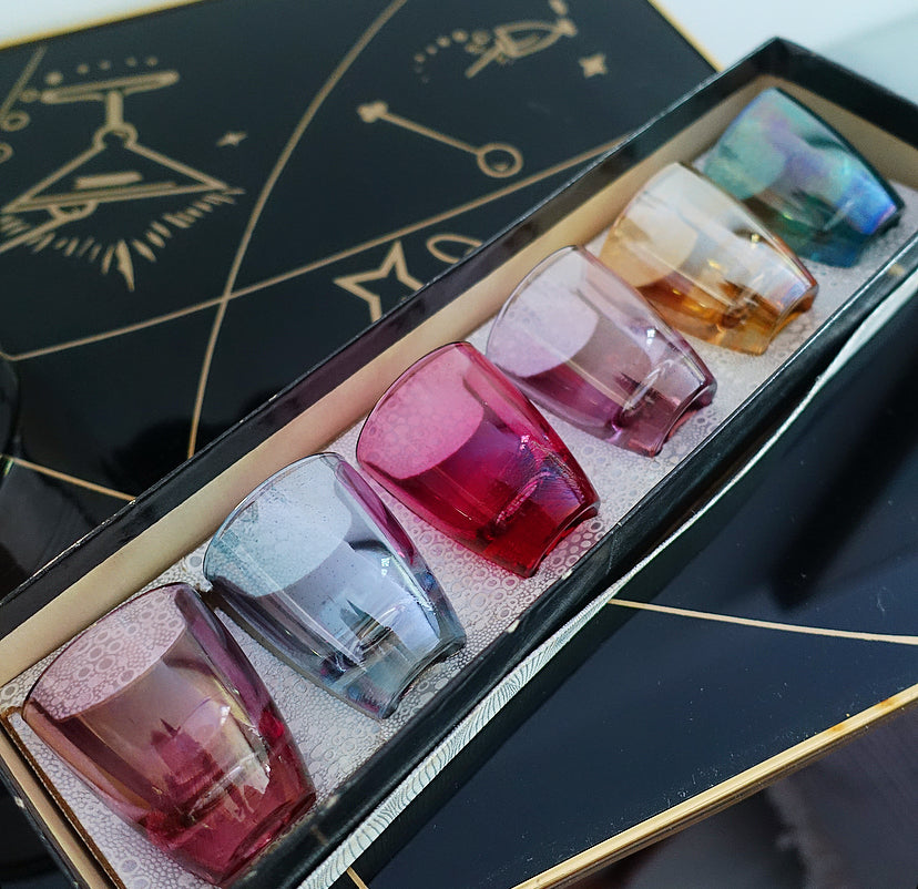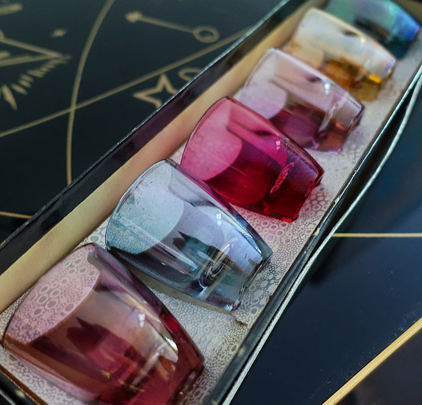 Set of six Mid-Century French iridescent glass shot glasses in box, c.1960s