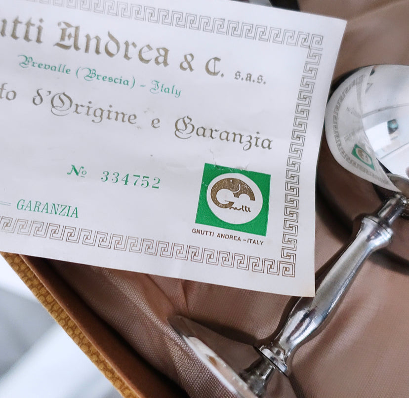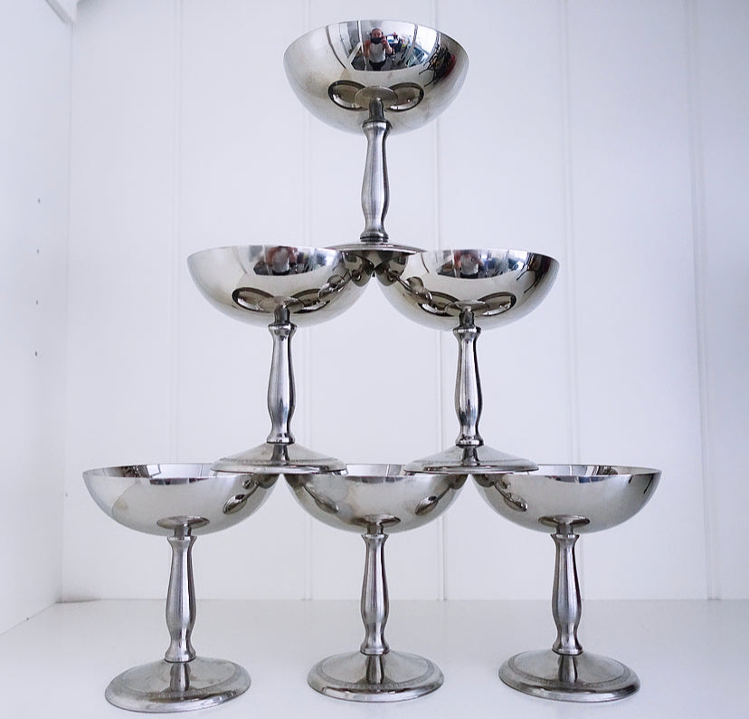 Wonderful set of six Italian MCM Inox stainless steel coupes with spoons in original box, c.1970S. Ideal for serving fizz, starters & desserts. Super cute with a bow tied around them for special occasions!