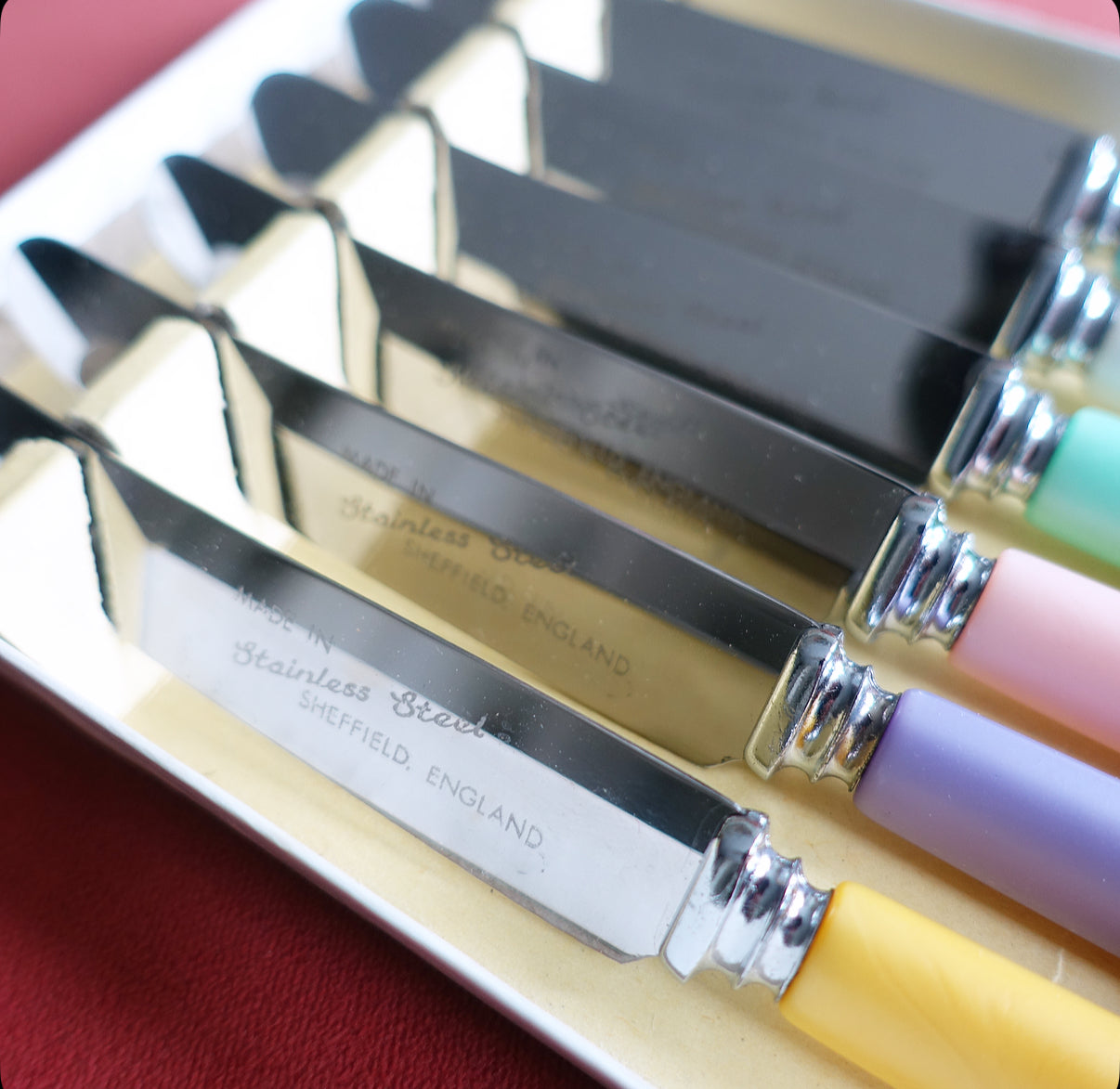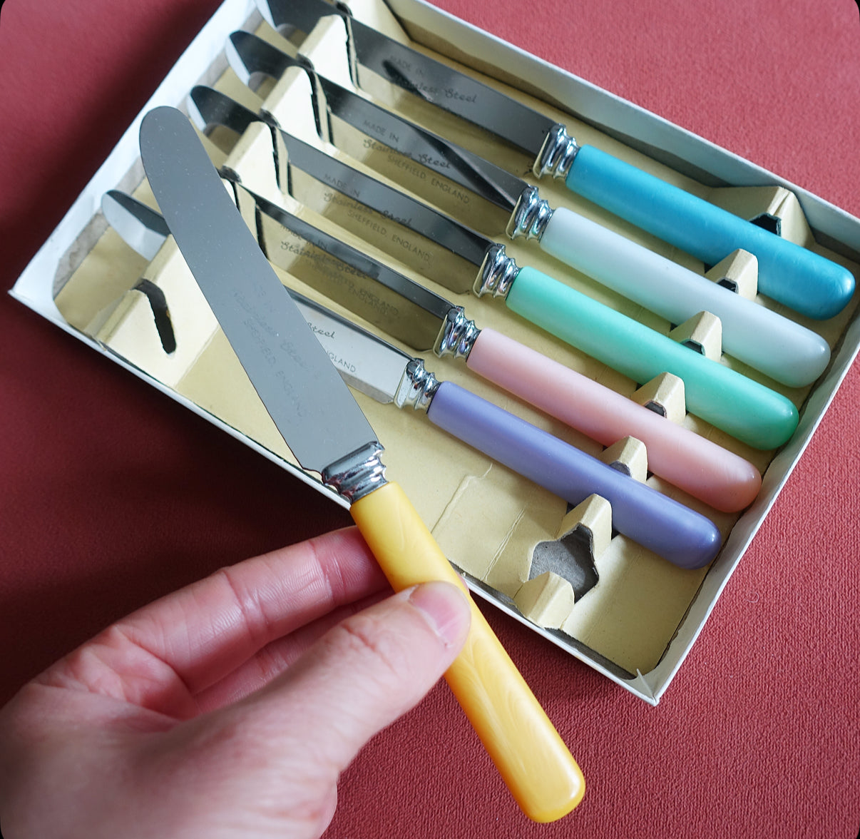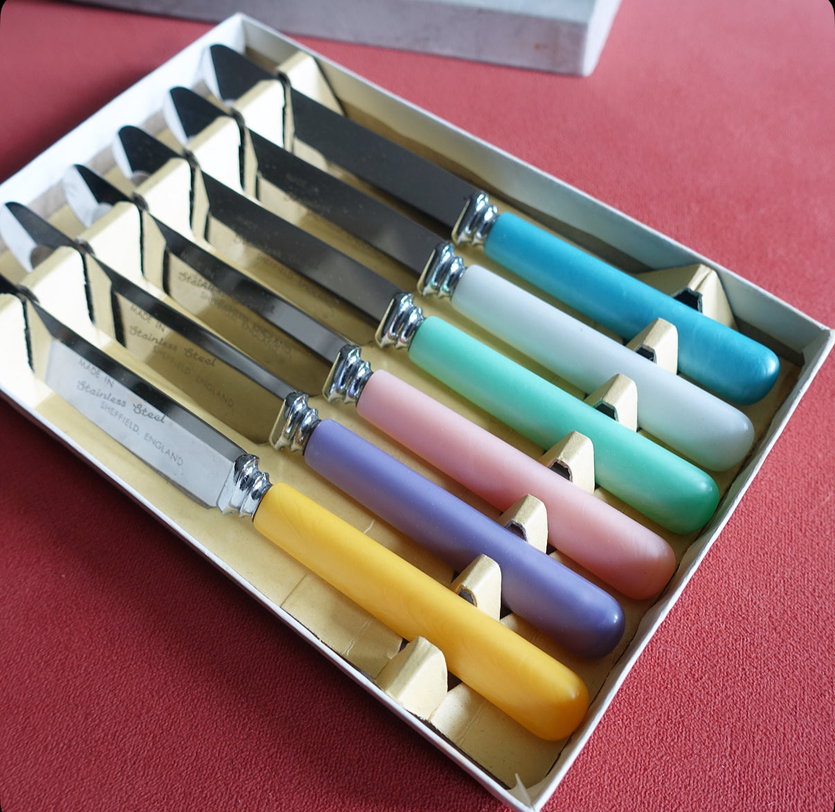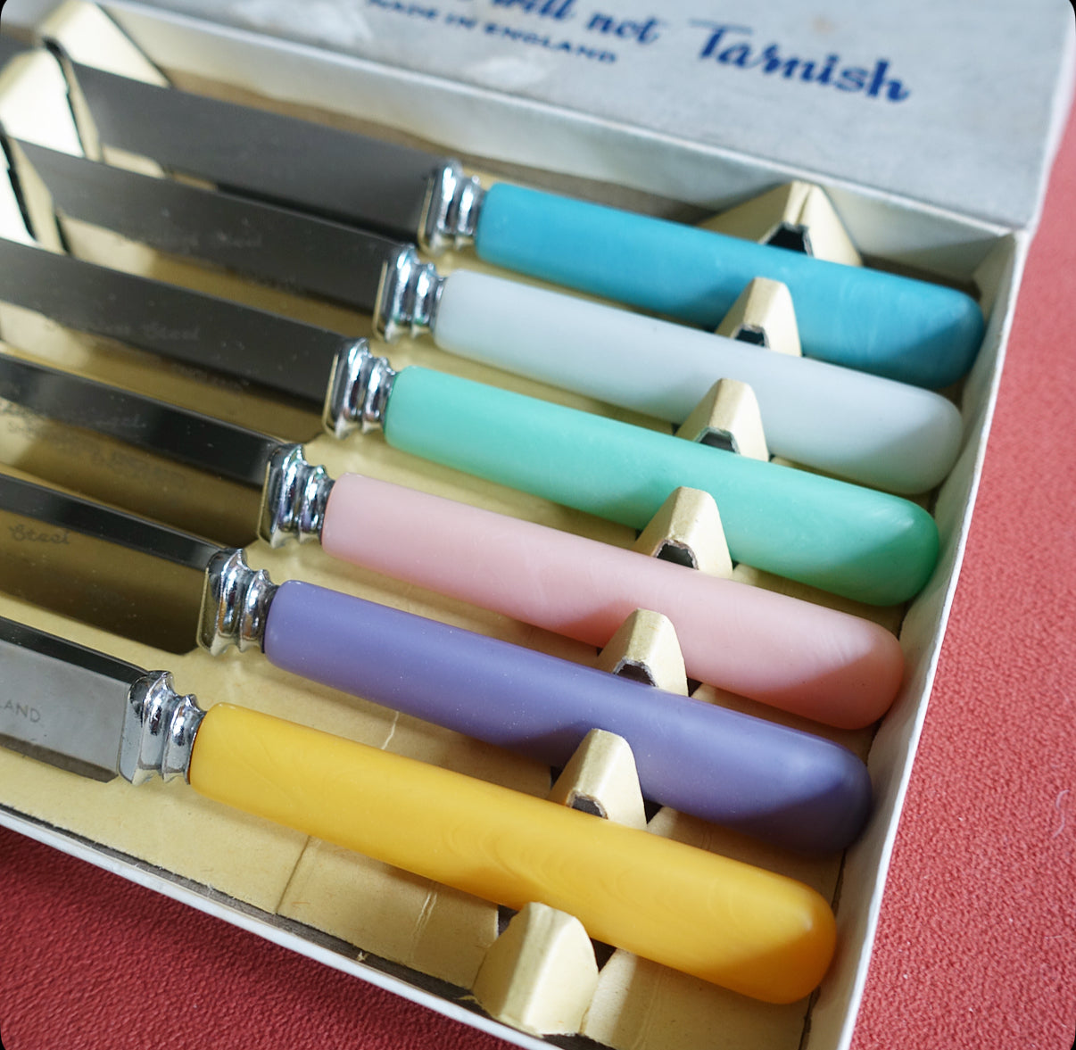 Set of six Mid-Century stainless steel and pastel pearlescent handled tea knives in original box, c.1950s/60s