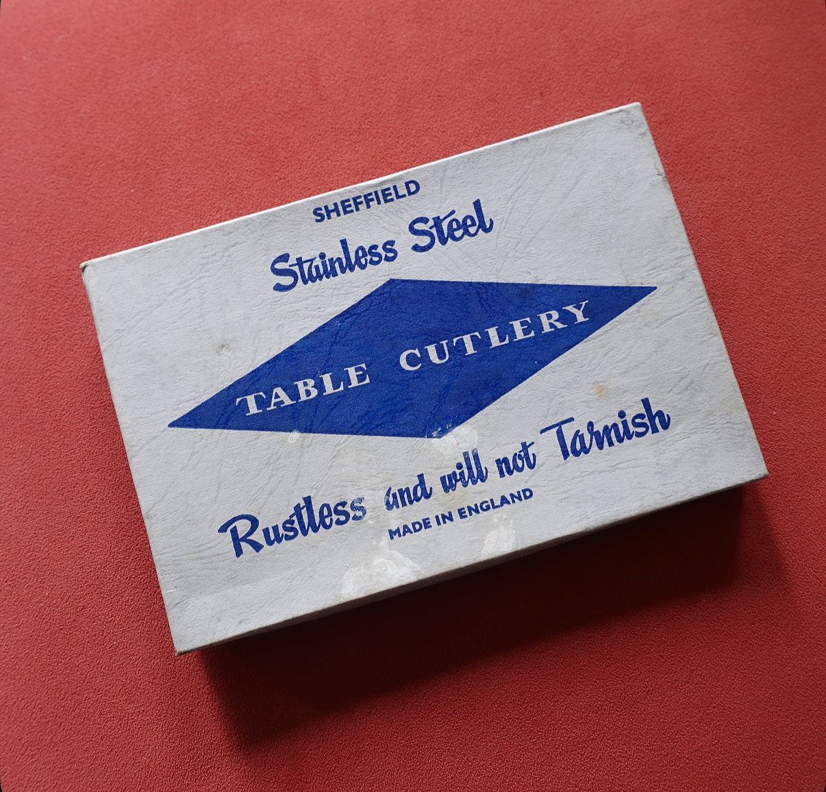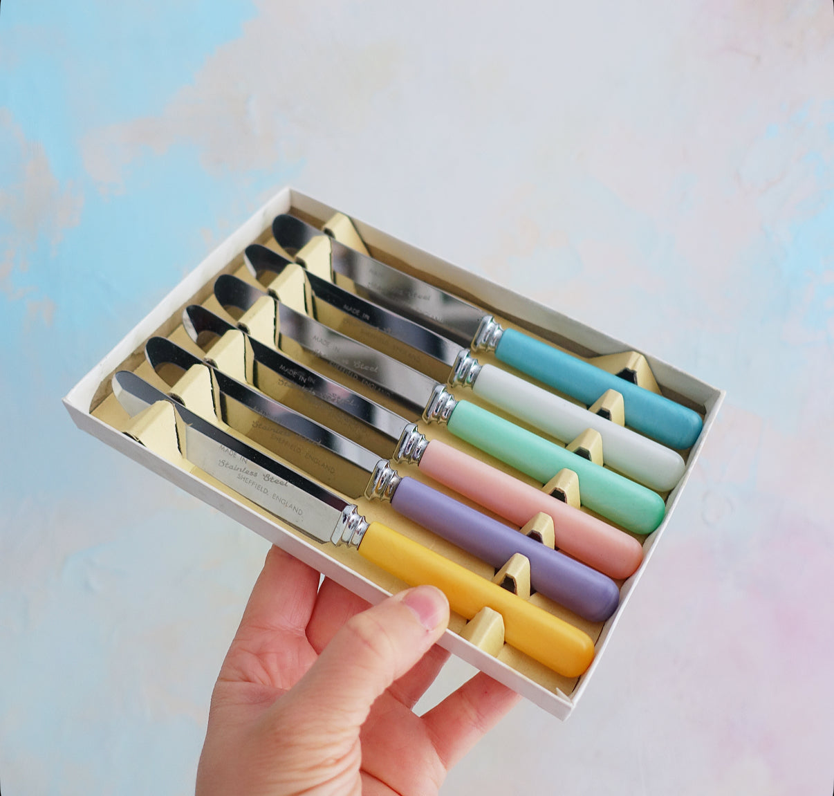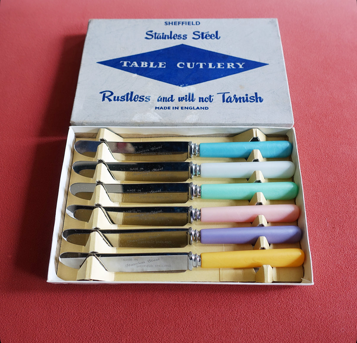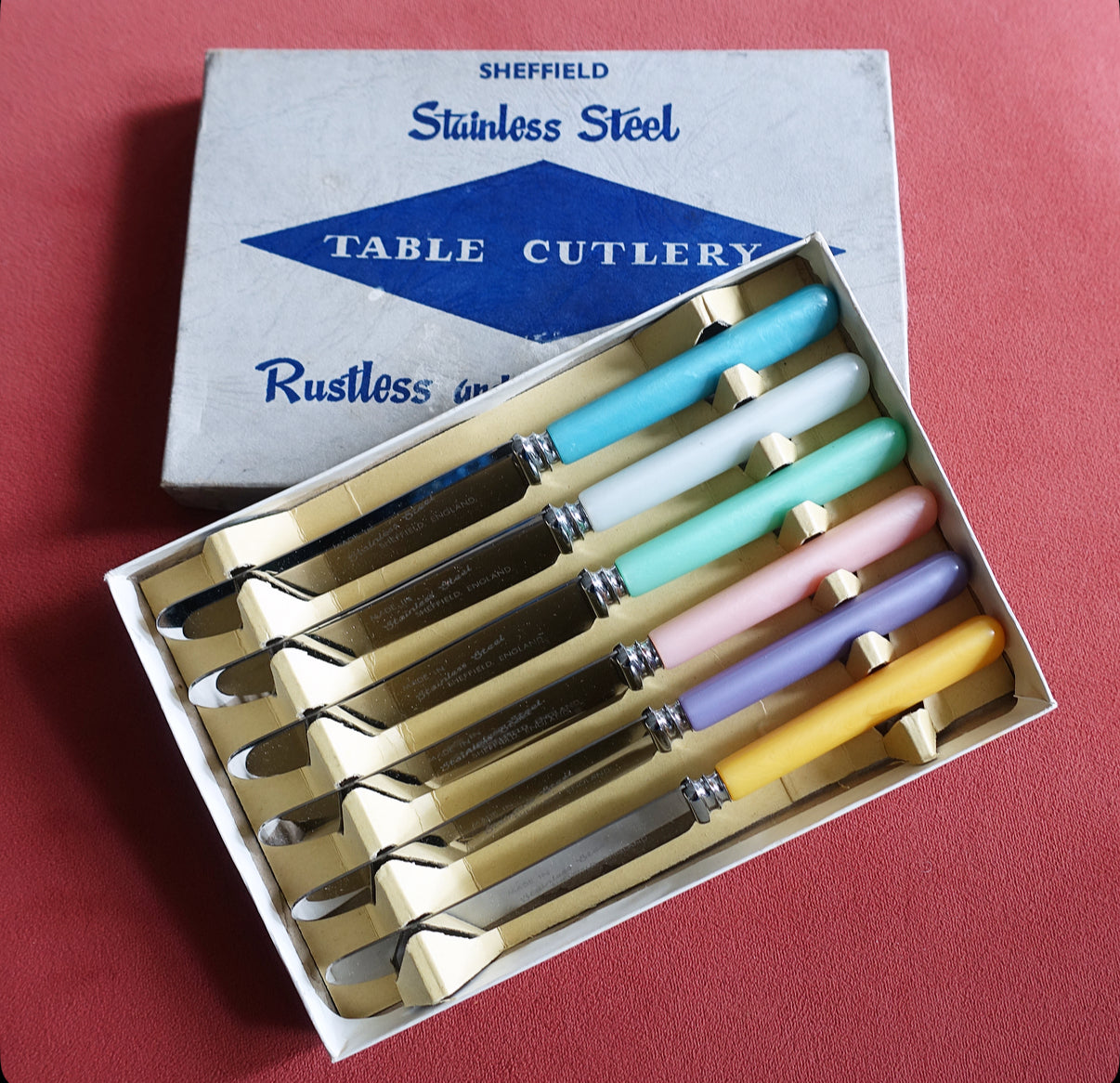 Set of six Mid-Century stainless steel and pastel pearlescent handled tea knives in original box, c.1950s/60s