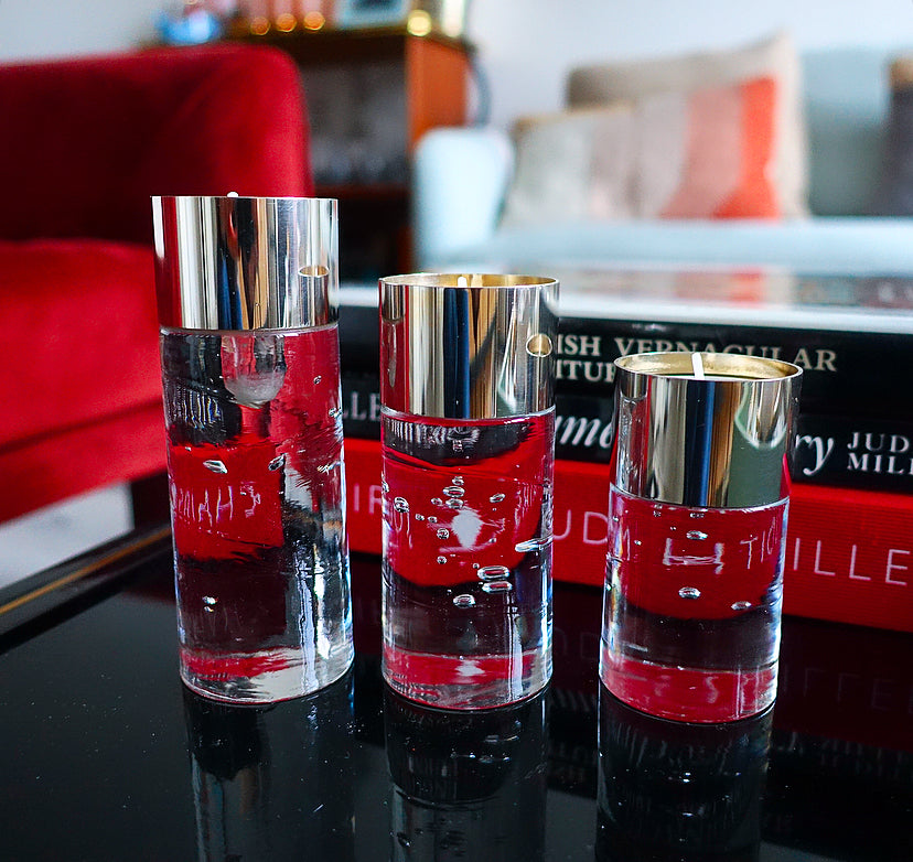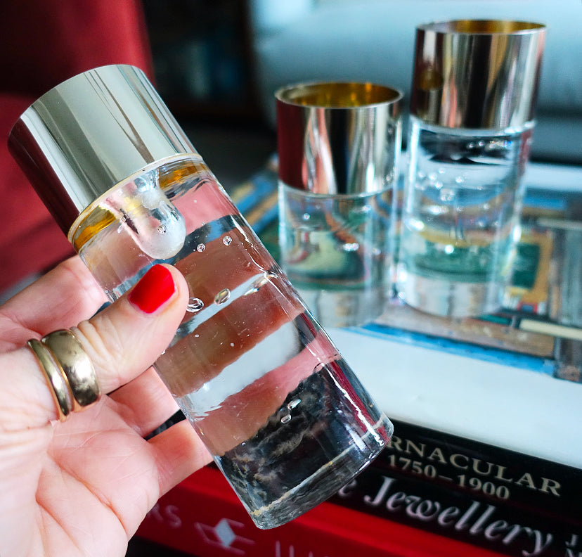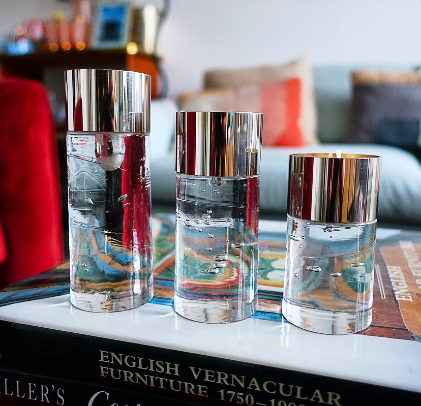 Set of three controlled bubble glass & brass tea light candle holders by Nybro Sweden, c.1980s