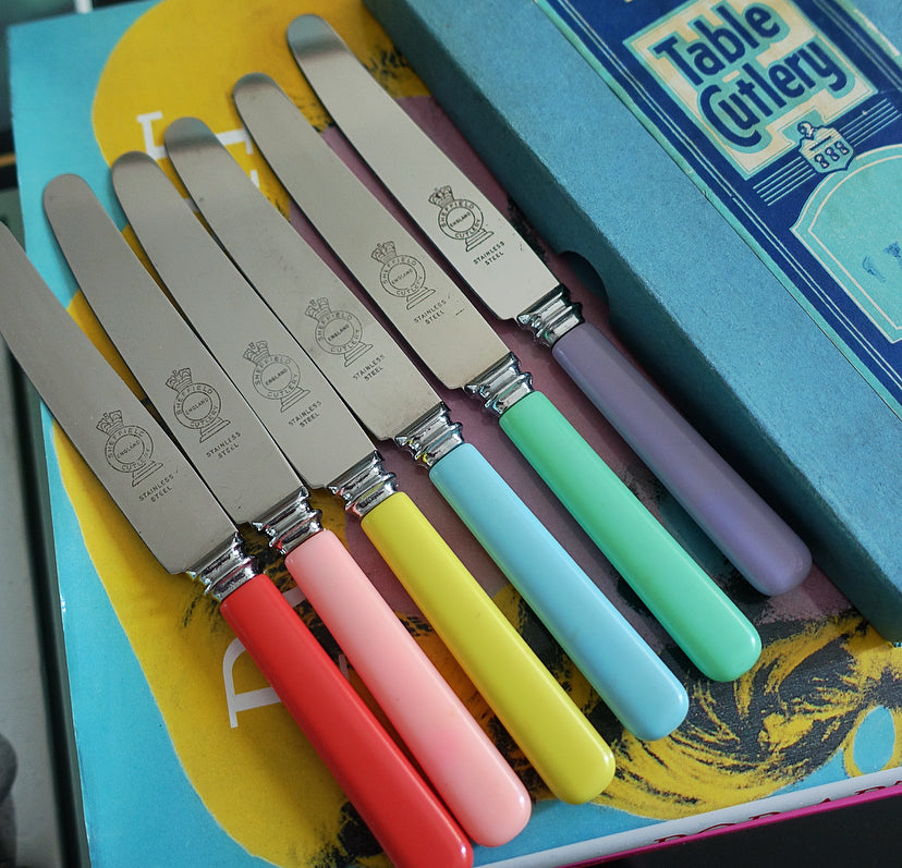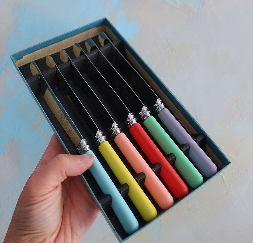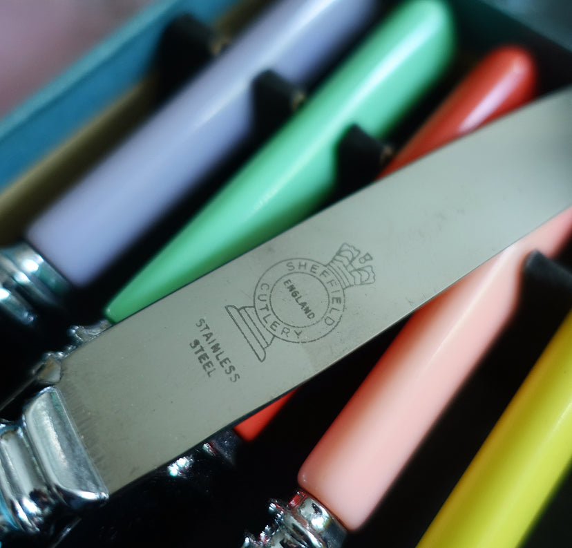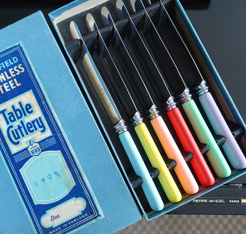 Set of six Mid-Century Sheffield stainless steel & rainbow Bakelite handled knives in original box, c.1950s/60s