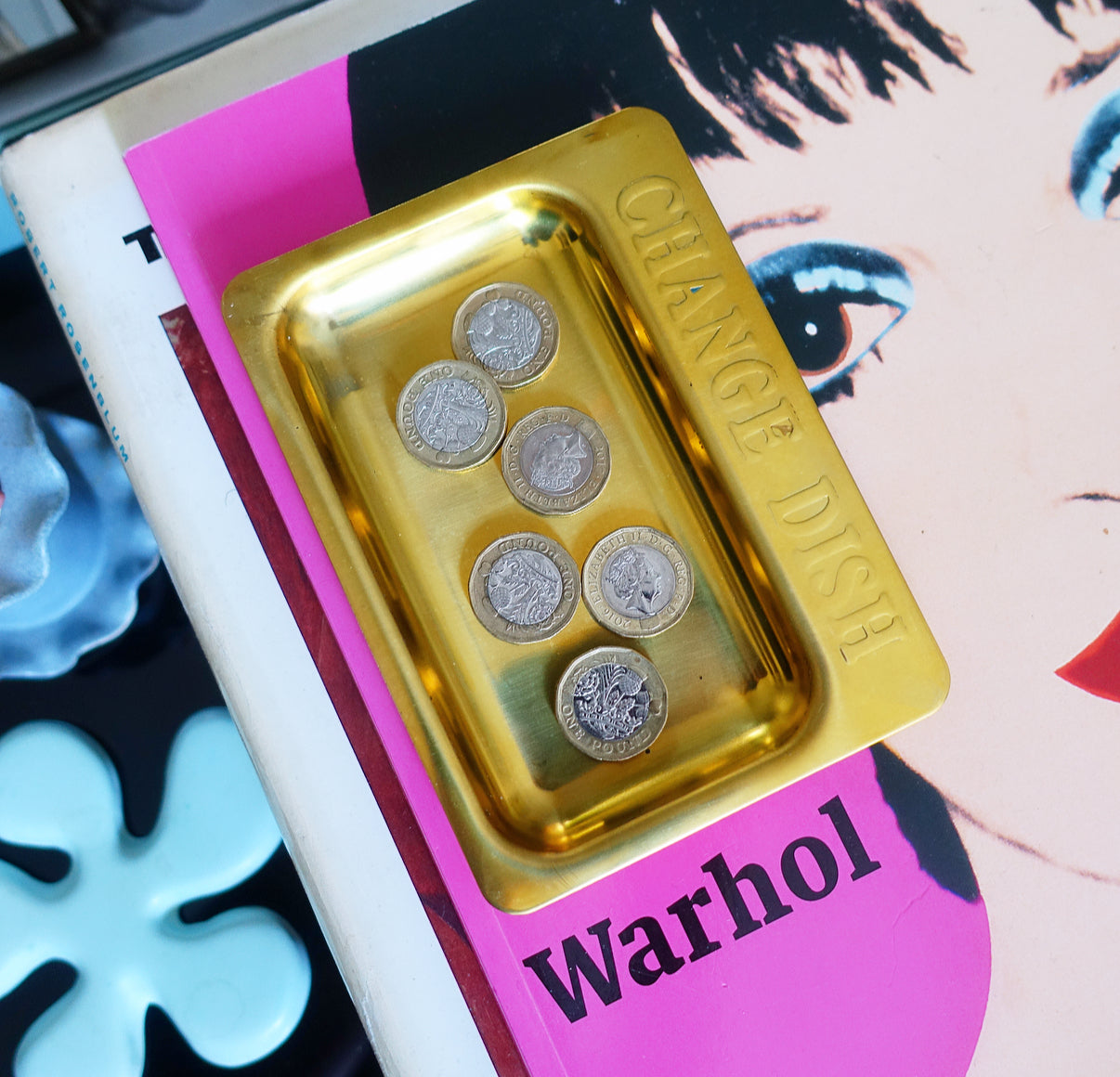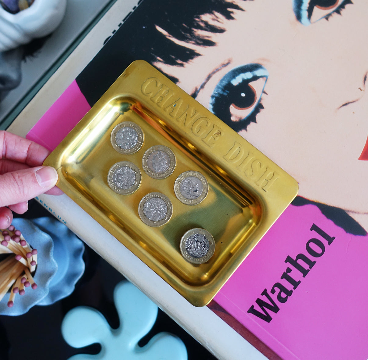 Vintage lacquered brass rectangular pocket change dish, c.1980s/90s